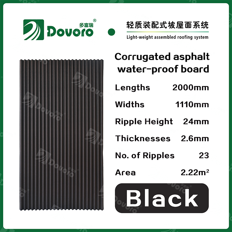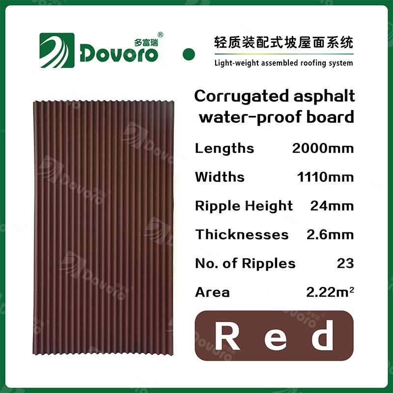 The Dovoro corrugated asphalt water-proof board is the lower layer of various tile materials, which has functions such as waterproofing, breathability, insulation and dehumidification. It is easy to cooperate with other insulation materials and roof tiles, not only reducing the total cost of roof engineering, but also making construction simpler, thus ensuring the quality of roof engineering.