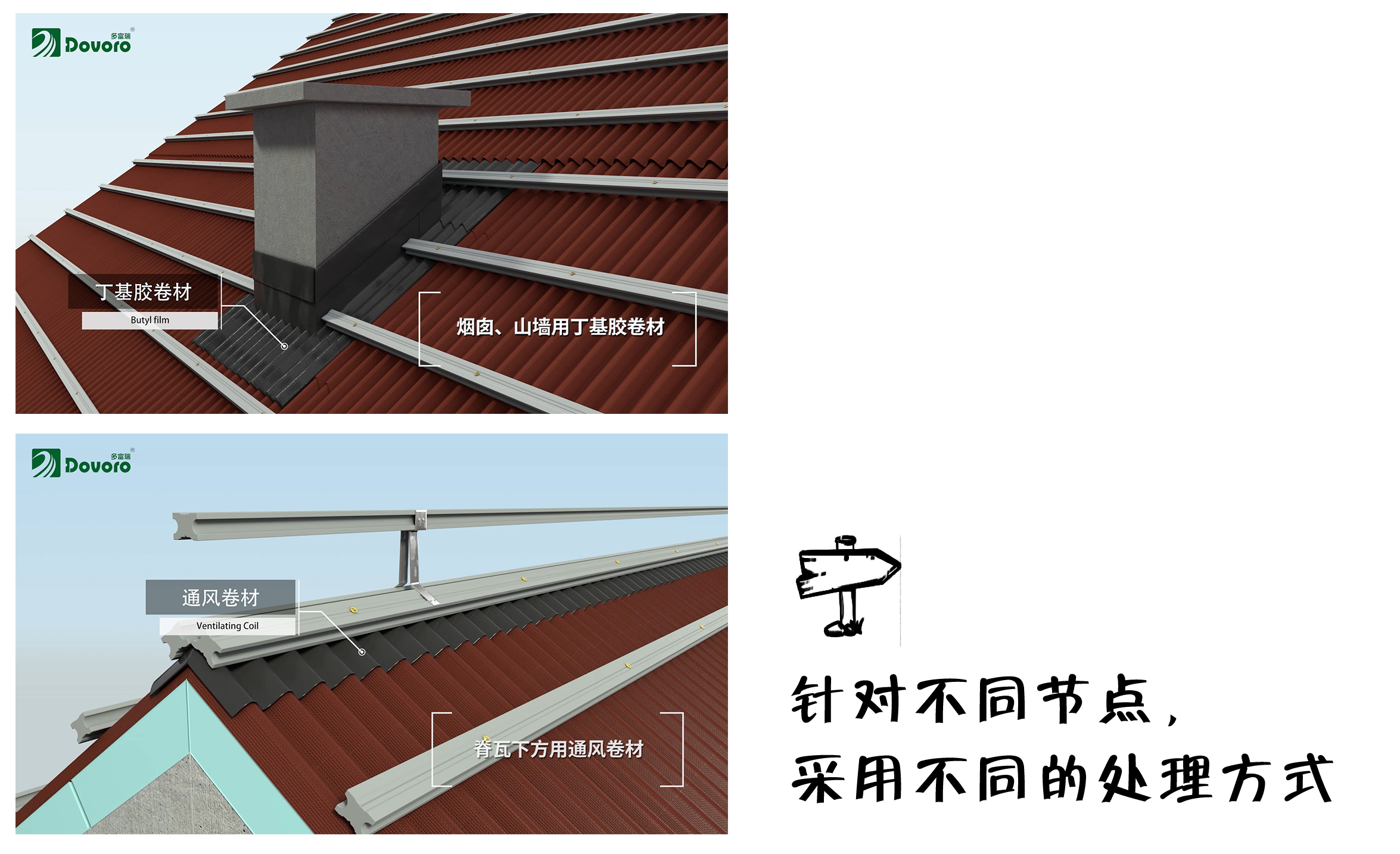 多富瑞精心設(shè)計了不同位置的節(jié)點處理方式,如屋脊、天溝、煙囪等位置,使用防水卷材或通風(fēng)卷材輔助防水。無需像傳統(tǒng)坡屋面需要大量使用防水卷材,僅在部分位置加強防水性。