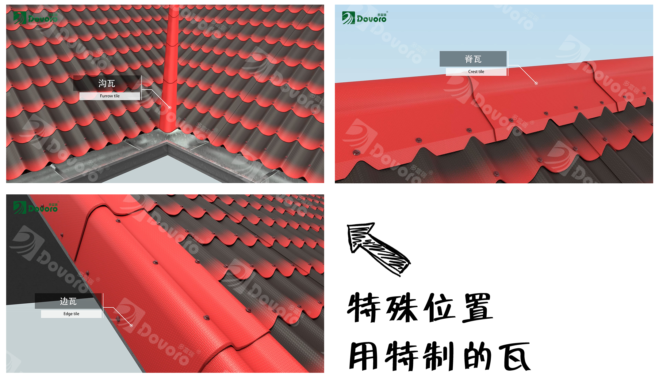 脊瓦、溝瓦、檐口瓦等針對特殊位置的專用波形瀝青瓦,可使不同角度瓦材之間也可以嚴絲合縫。