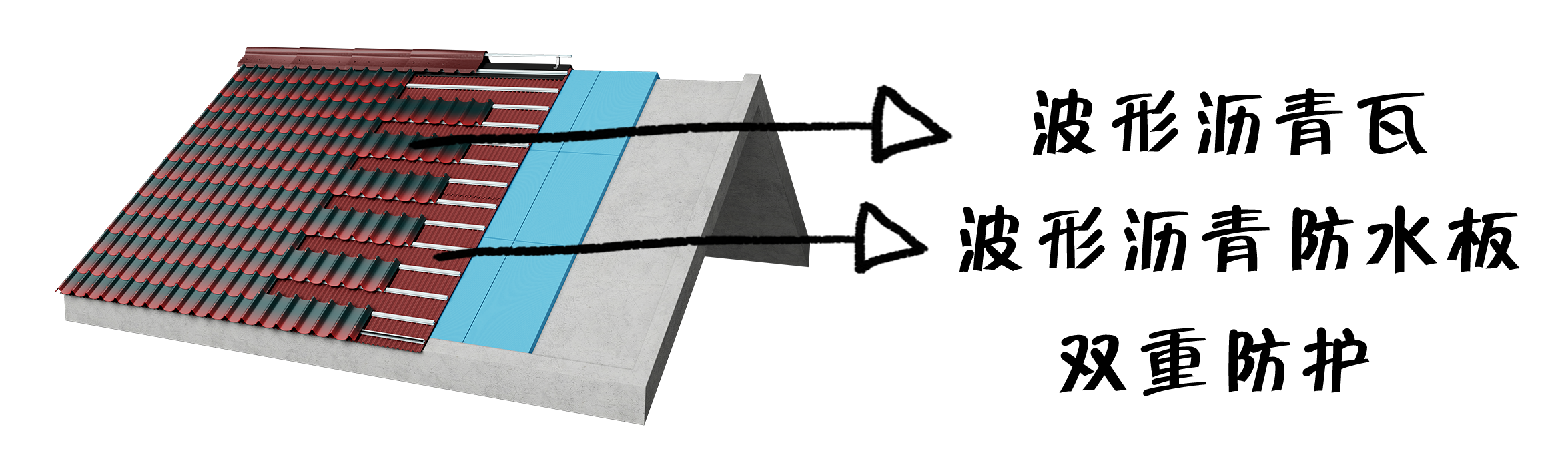 使用波形瀝青防水板作為防水墊層,在遇到極端暴雨的情況下,即使有部分雨水來不及排出屋面,從上層瓦材滲入下方,也可以通過波形瀝青防水板繼續(xù)排出屋面。相當于一個屋頂上有兩層屋面,雙重防水。