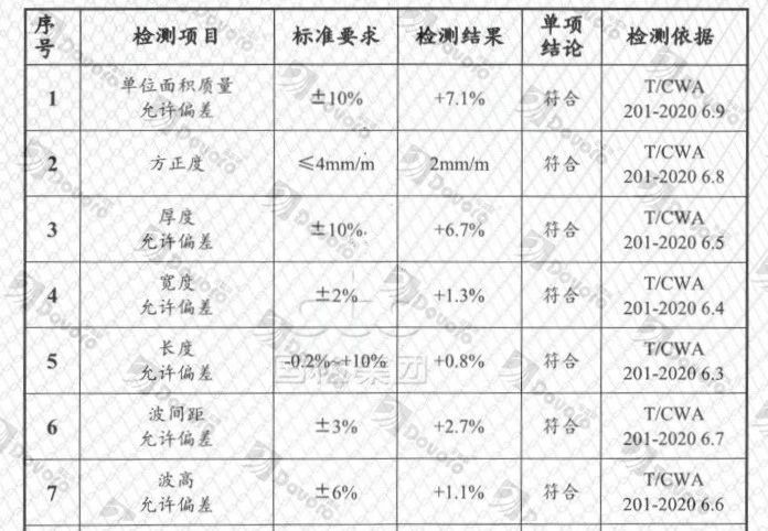 打開一份波形瀝青瓦的檢測報(bào)告,用數(shù)據(jù)來告訴你。本報(bào)告由國家建筑材料檢測中心檢測后編制,判定依據(jù)為T/CWA201-2020《波形瀝青瓦》