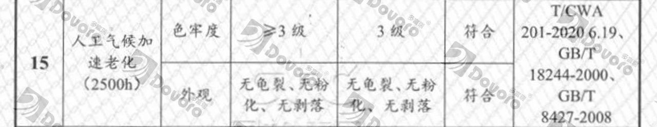最后一項(xiàng)檢測是人工氣候加速老化測試,模擬不同的氣候條件,測試瓦材的外觀是否會(huì)有變化。經(jīng)過測試后色牢度為三級,外觀沒有發(fā)生油漆龜裂、粉化、剝落的情況。