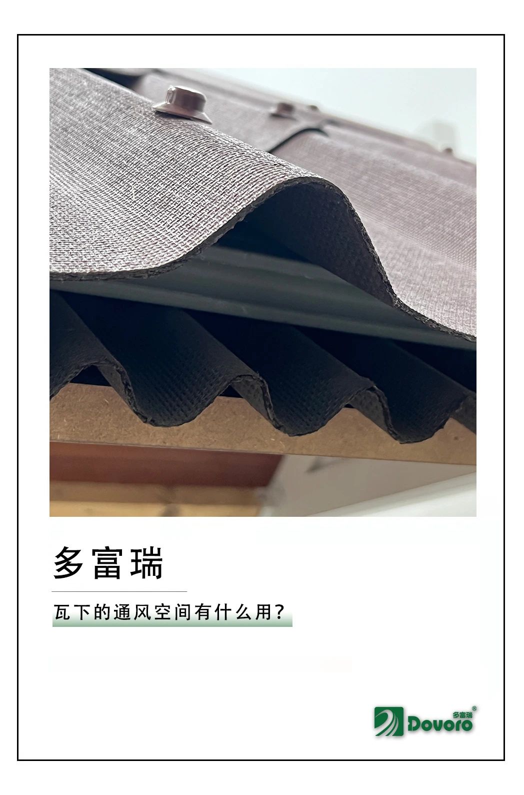 得益于多富瑞輕質(zhì)坡屋面系統(tǒng)的立體構(gòu)造,在上層的波形瀝青瓦與下層的波形瀝青防水板之間,有著每平方米200cm³的通風(fēng)通道。