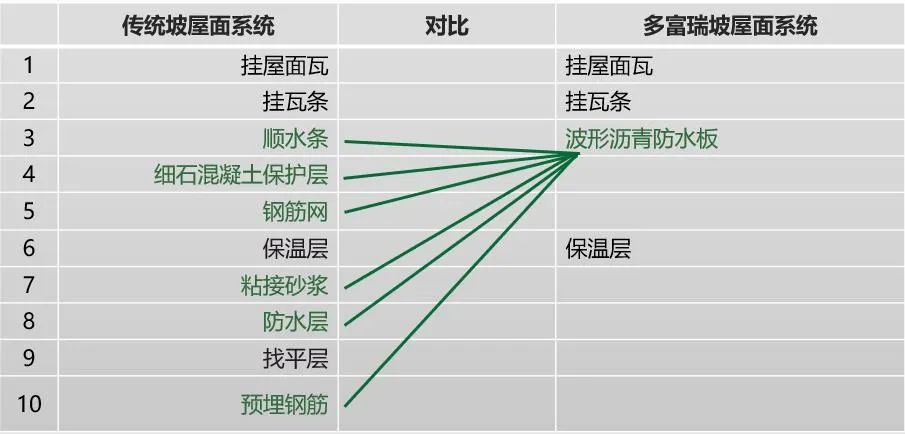 輕質(zhì)坡屋面系統(tǒng)的核心材料——波形瀝青防水板,替代傳統(tǒng)屋面中的順?biāo)畻l、混凝土保護(hù)層、鋼筋網(wǎng)等一系列工序,將各種工序集成到一張防水板中,使得整個坡屋面的構(gòu)造無比簡單。
