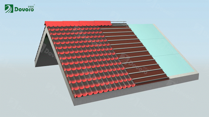 即使是在多富瑞輕質(zhì)坡屋面系統(tǒng)中,除了使用波形瀝青瓦,也可替換任意干掛瓦材,同樣可以獲得精簡的屋面構(gòu)造。