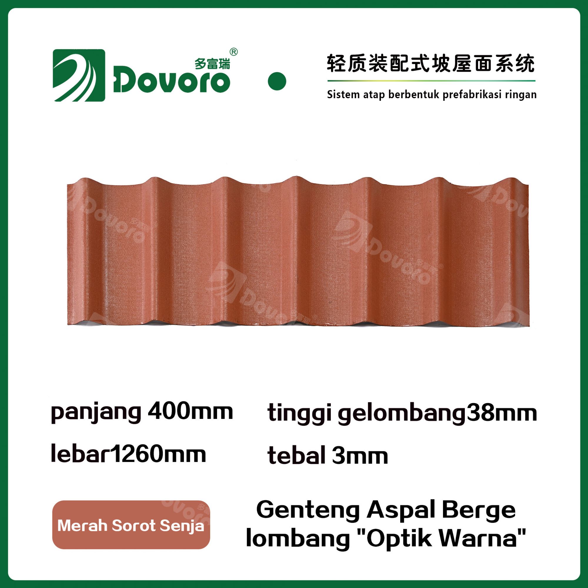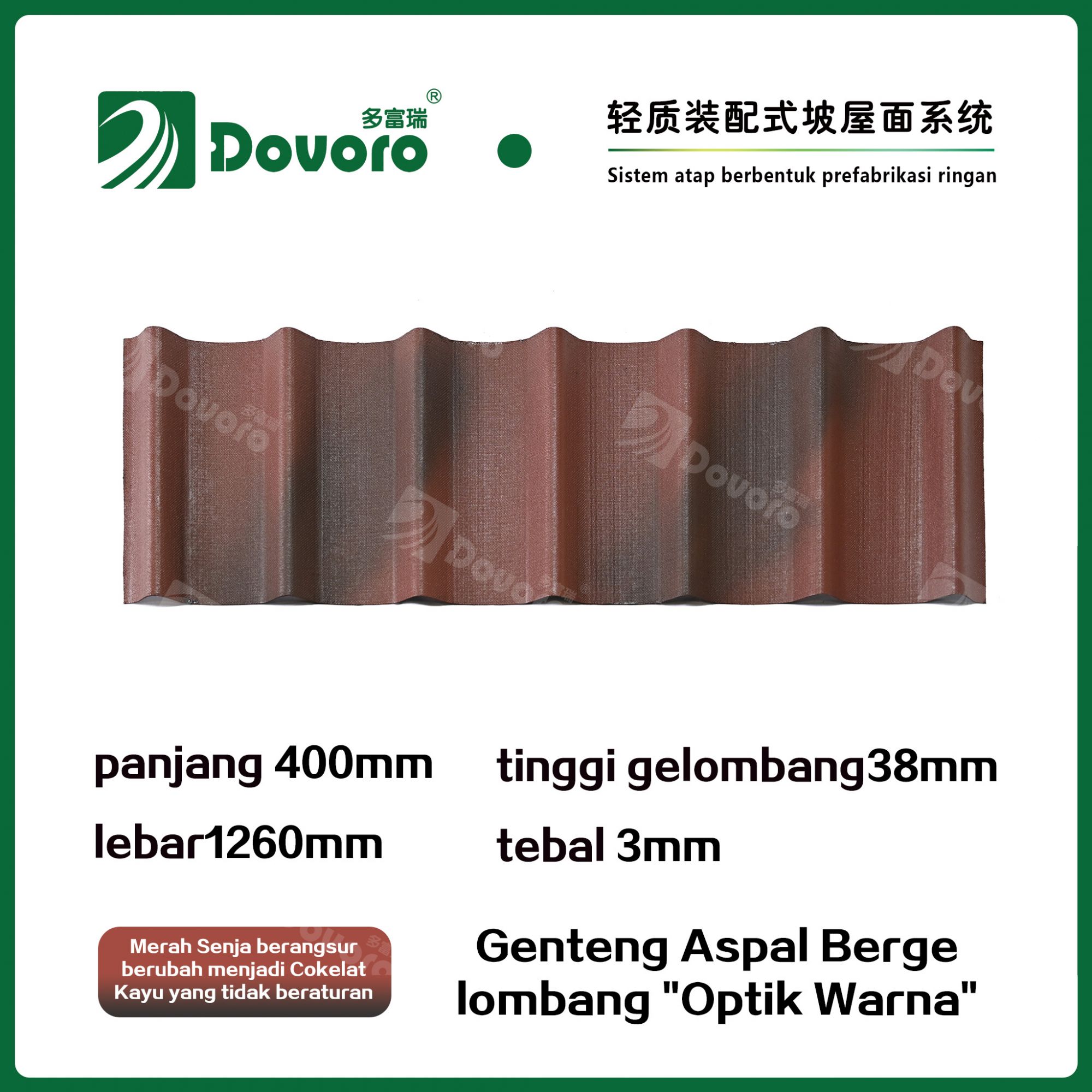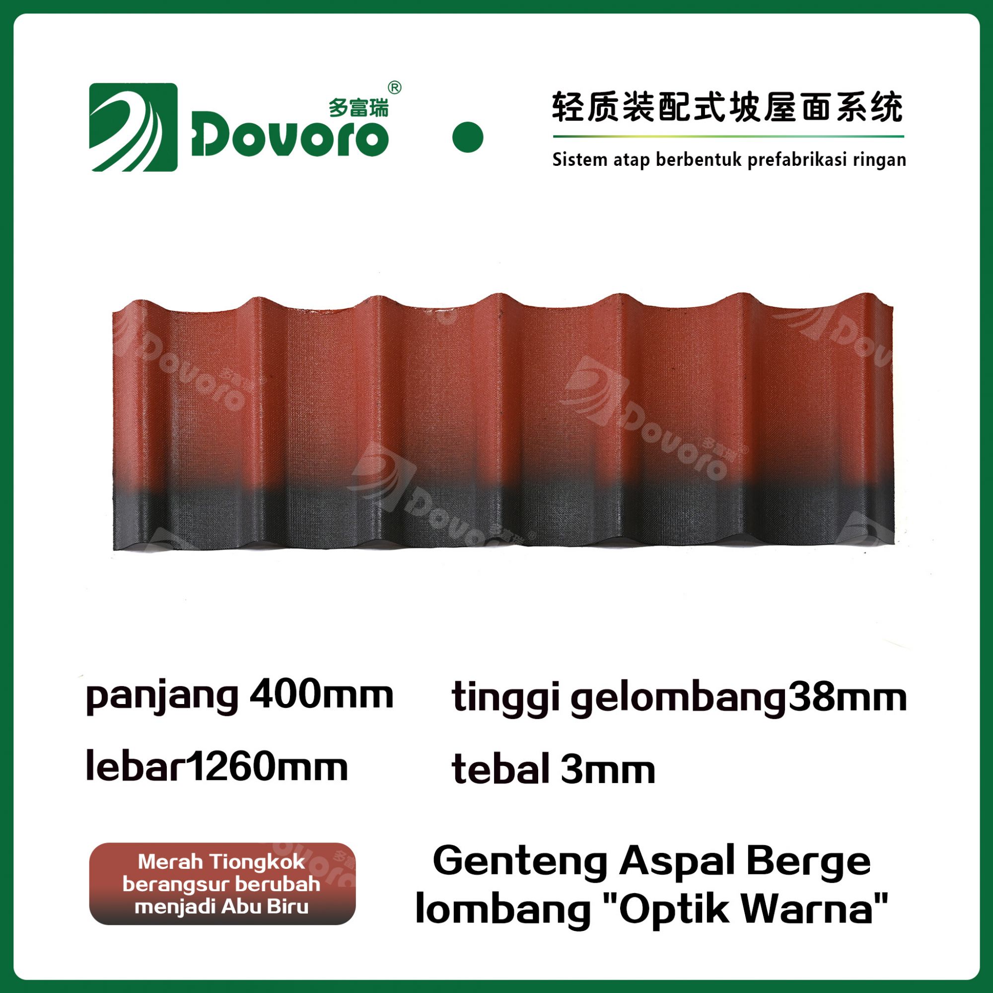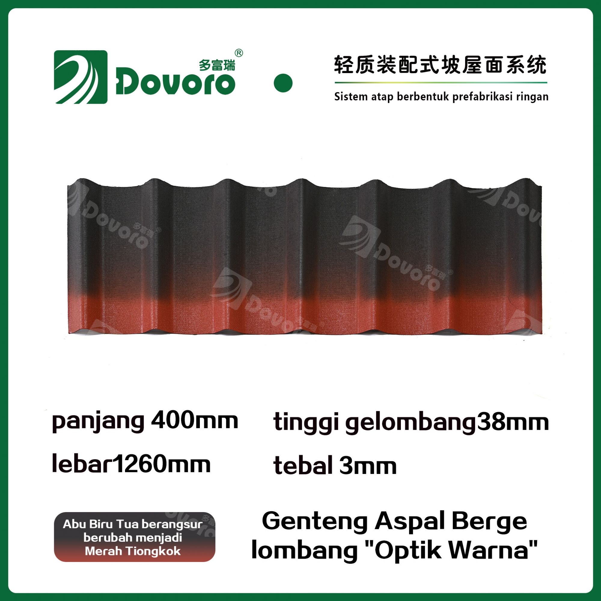 Genteng aspal bergelombang Dovoro "Optik Warna" terbuat dari serat mineral tumbuhan yang direndam dalam aspal. Lapisan dasar yang dibentuk sekali direndam dalam aspal pada suhu tinggi, membuat genteng lebih kokoh secara keseluruhan. Resin tahan panas memastikan kekuatan dan kekakuan genteng; Material baku impor, dikombinasikan dengan teknologi pewarnaan canggih, memastikan warnanya tahan lama, dan proses penyemprotan warna campuran membuat genteng terlihat elegan, indah dalam warna, dan memiliki tekstur tiga dimensi.