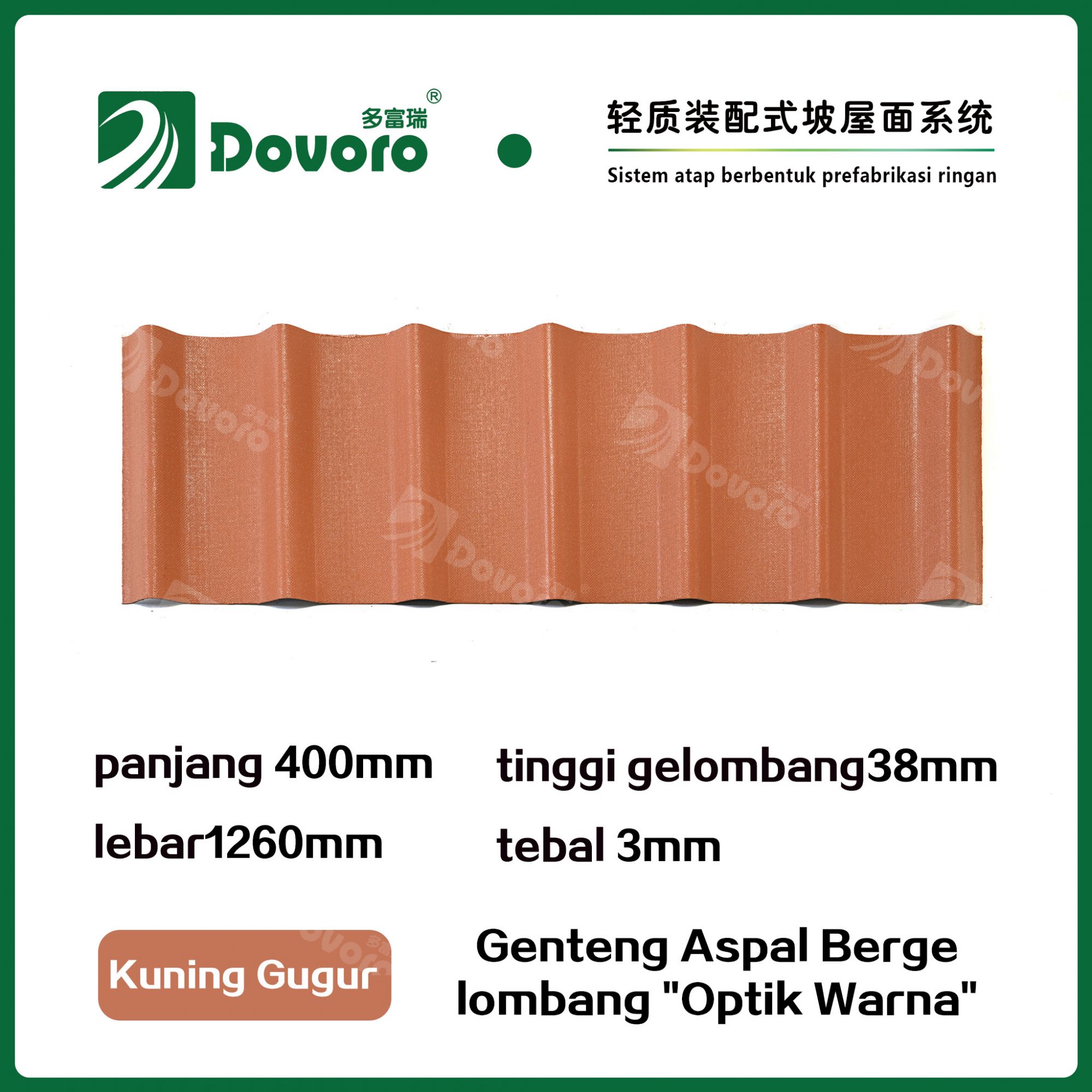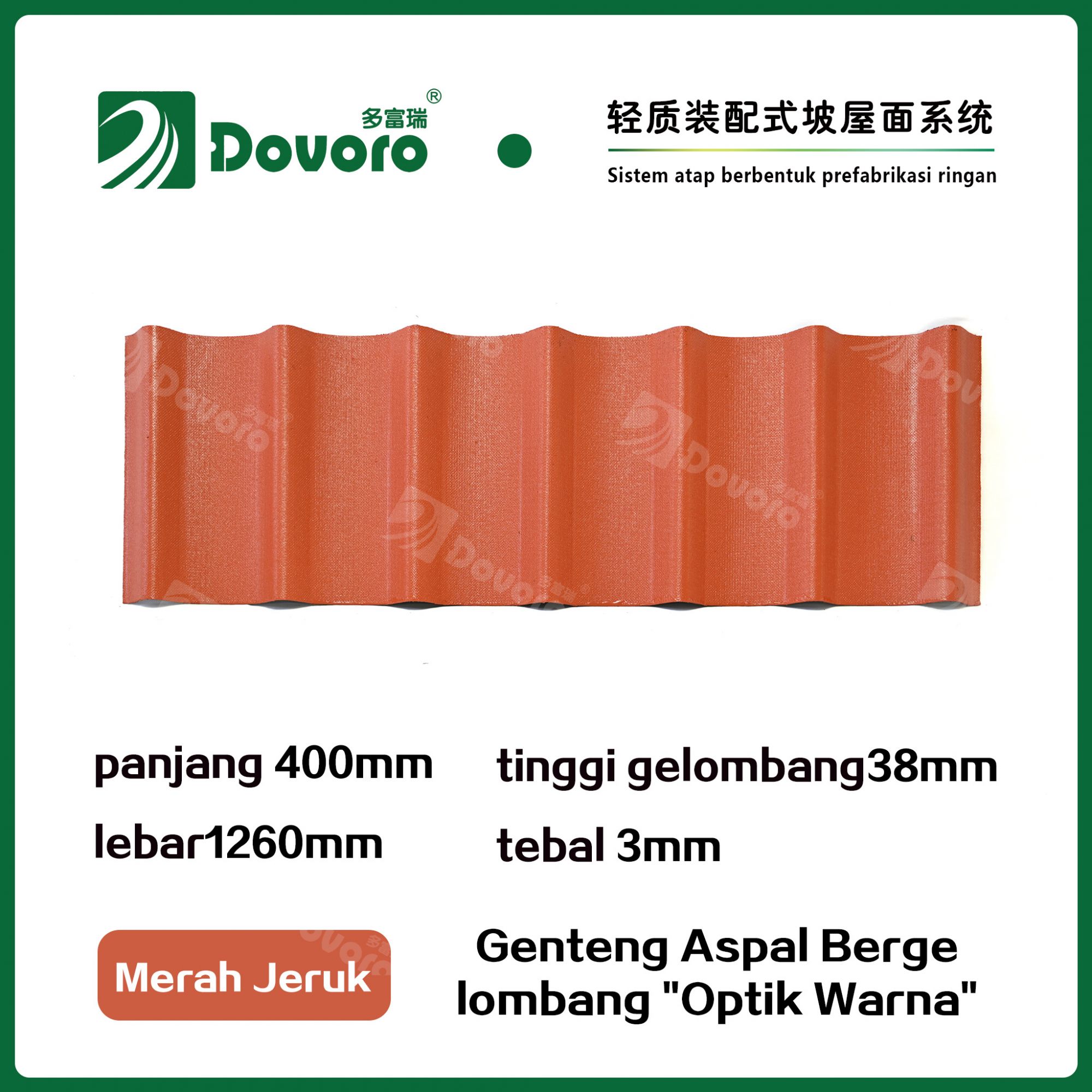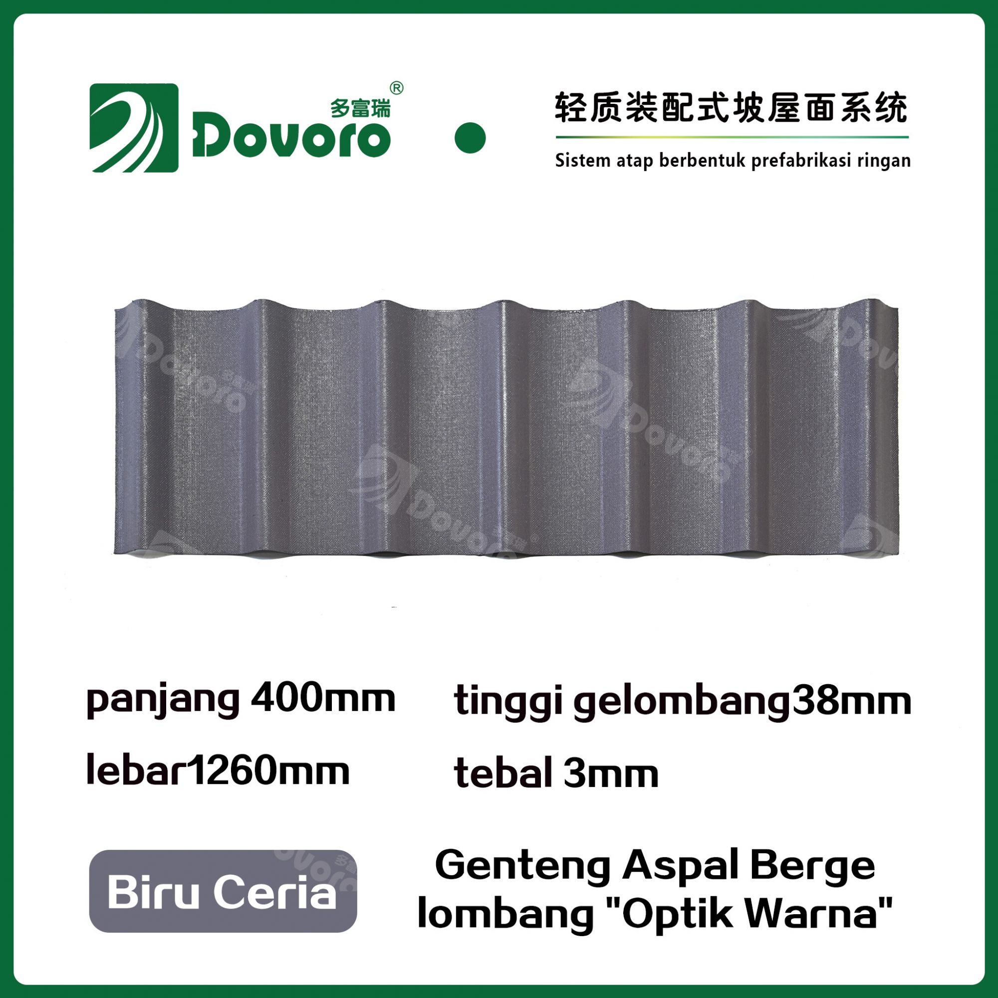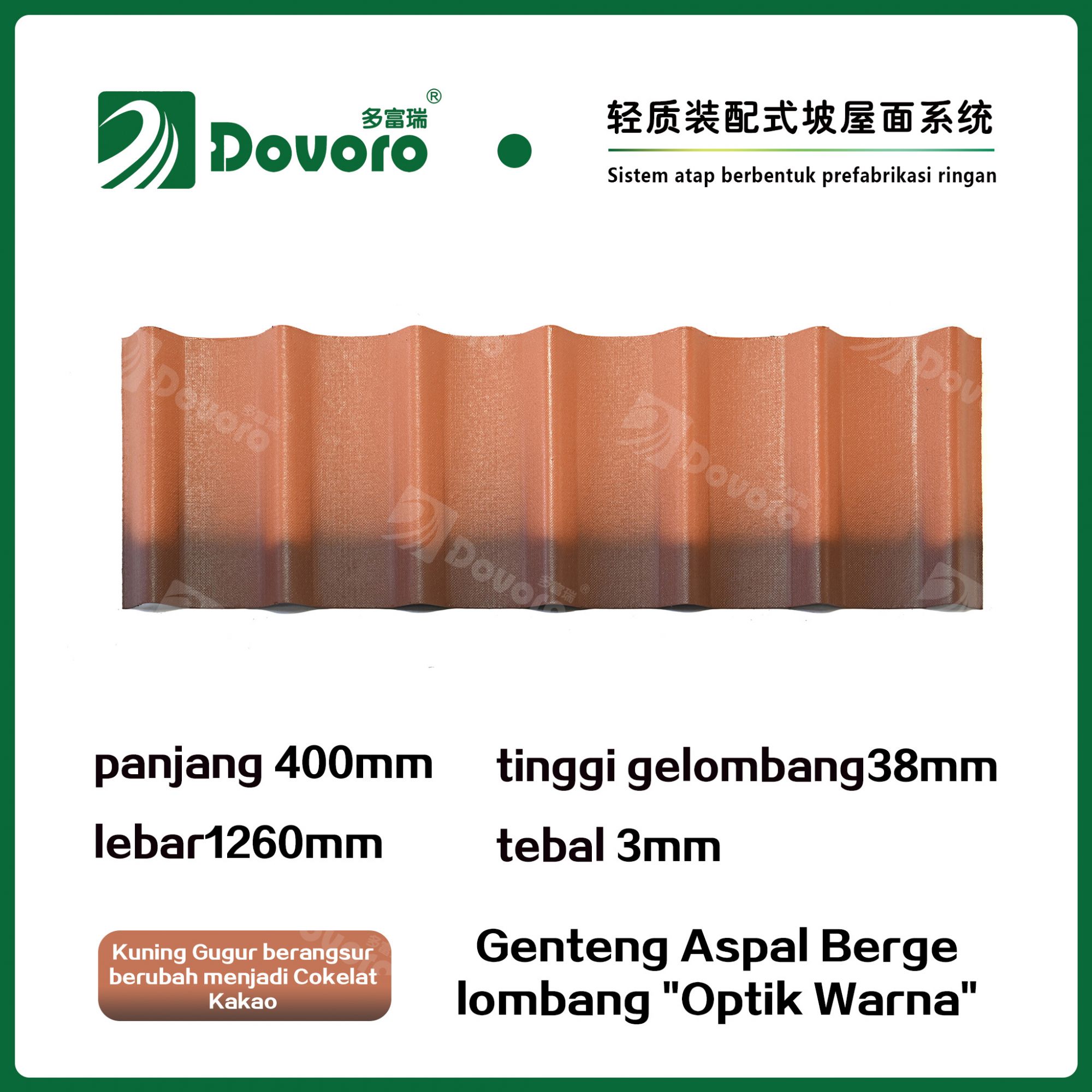 Genteng aspal bergelombang Dovoro "Optik Warna" terbuat dari serat mineral tumbuhan yang direndam dalam aspal. Lapisan dasar yang dibentuk sekali direndam dalam aspal pada suhu tinggi, membuat genteng lebih kokoh secara keseluruhan. Resin tahan panas memastikan kekuatan dan kekakuan genteng; Material baku impor, dikombinasikan dengan teknologi pewarnaan canggih, memastikan warnanya tahan lama, dan proses penyemprotan warna campuran membuat genteng terlihat elegan, indah dalam warna, dan memiliki tekstur tiga dimensi.