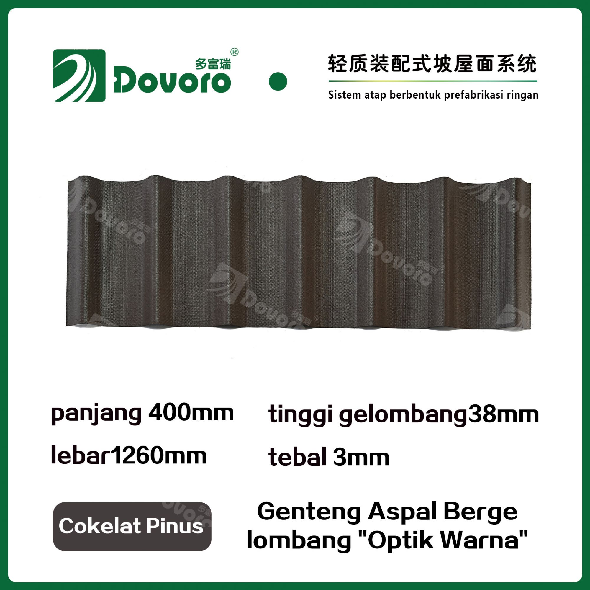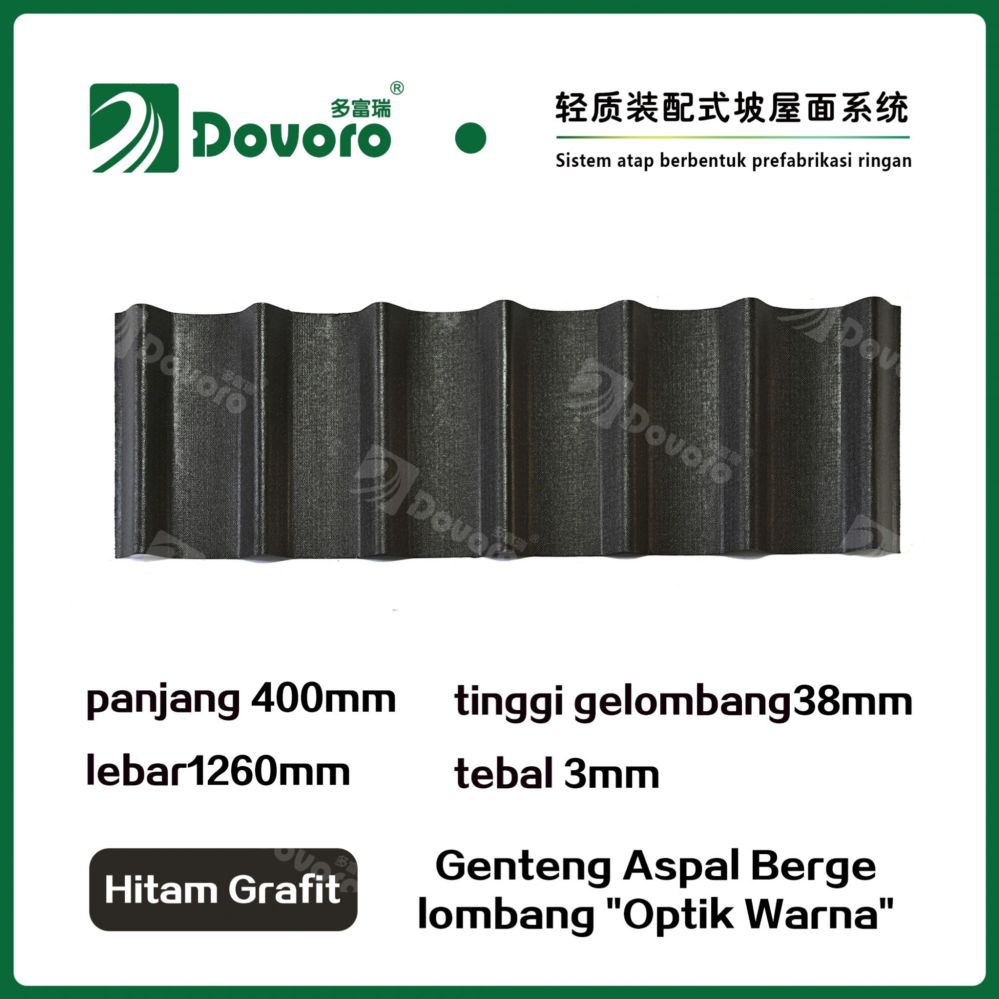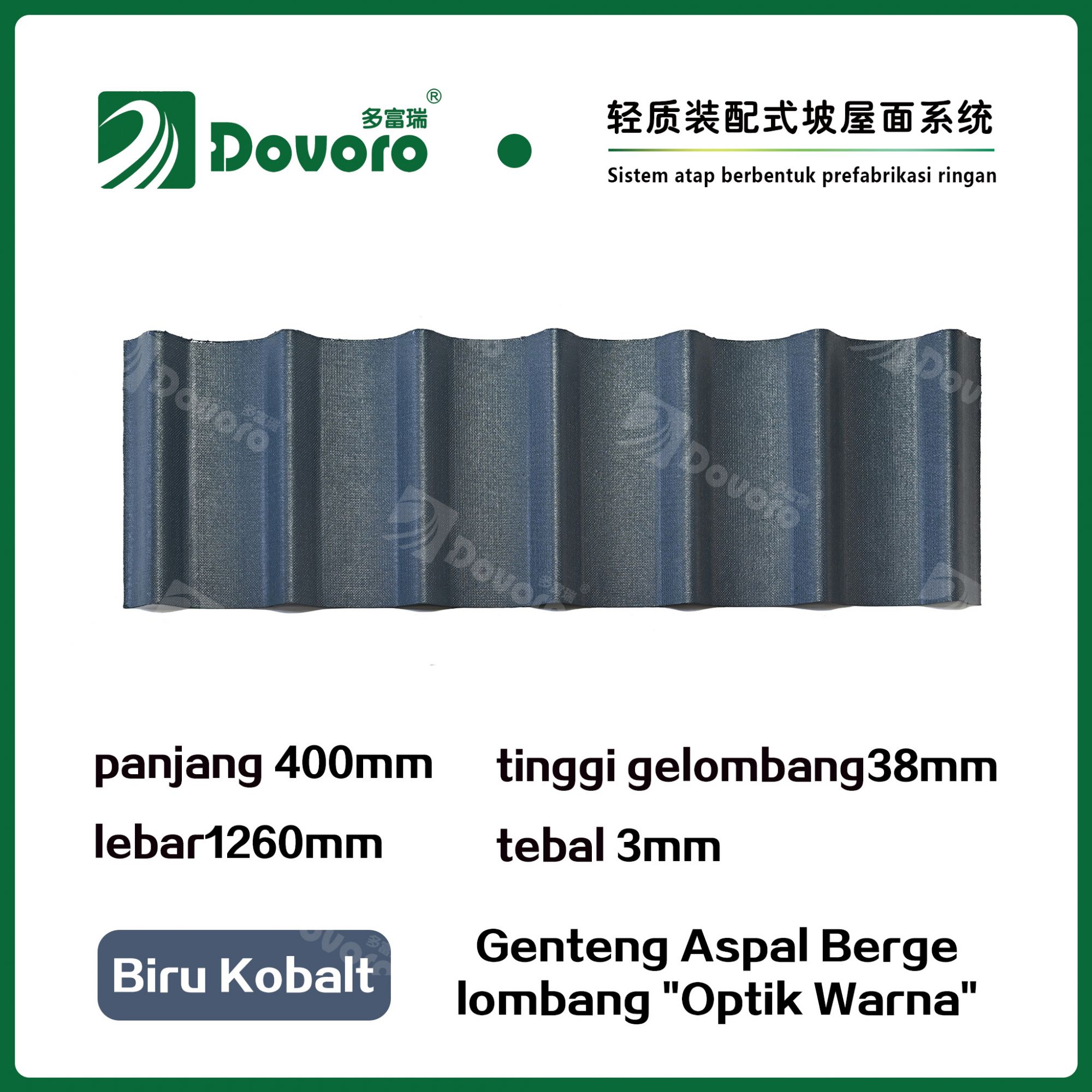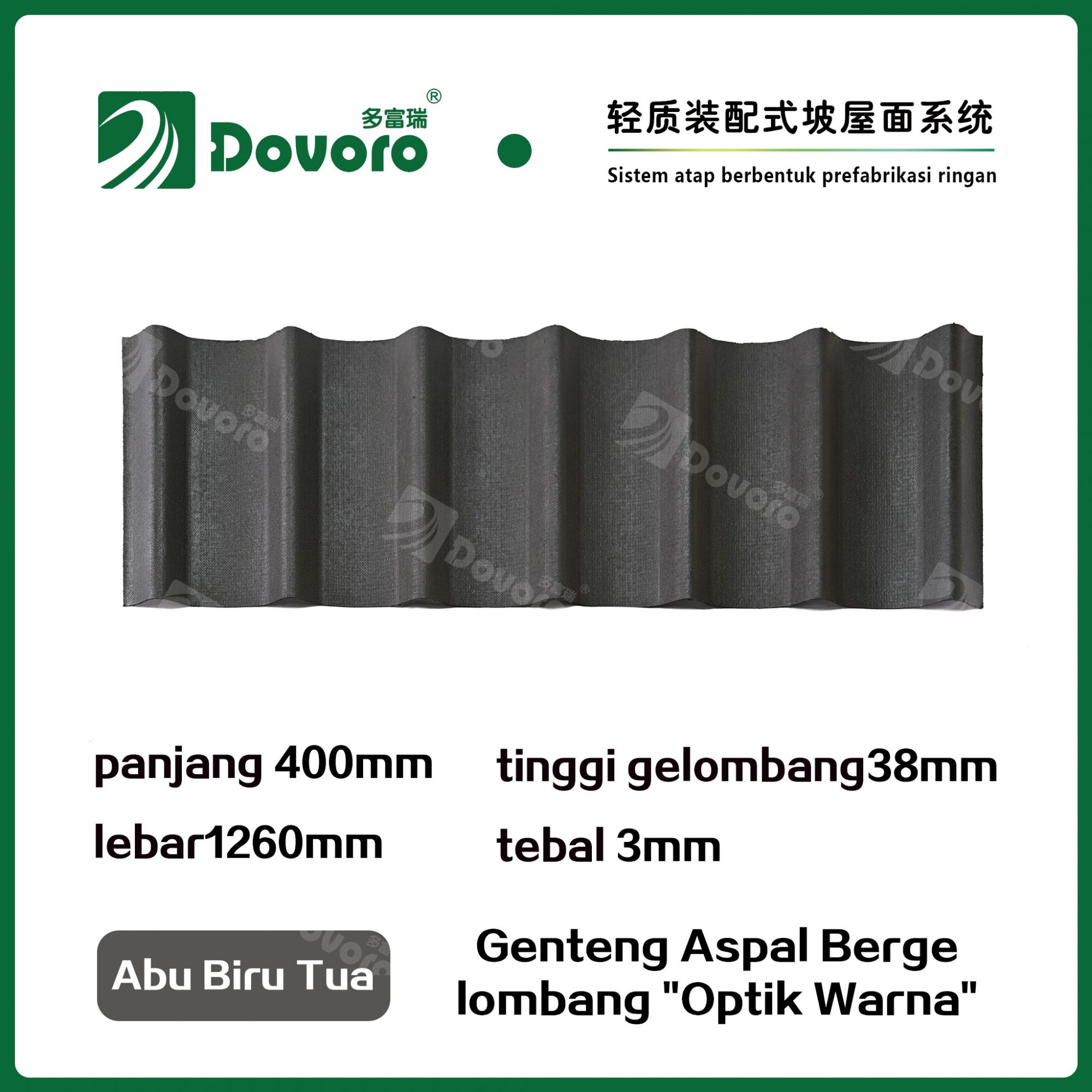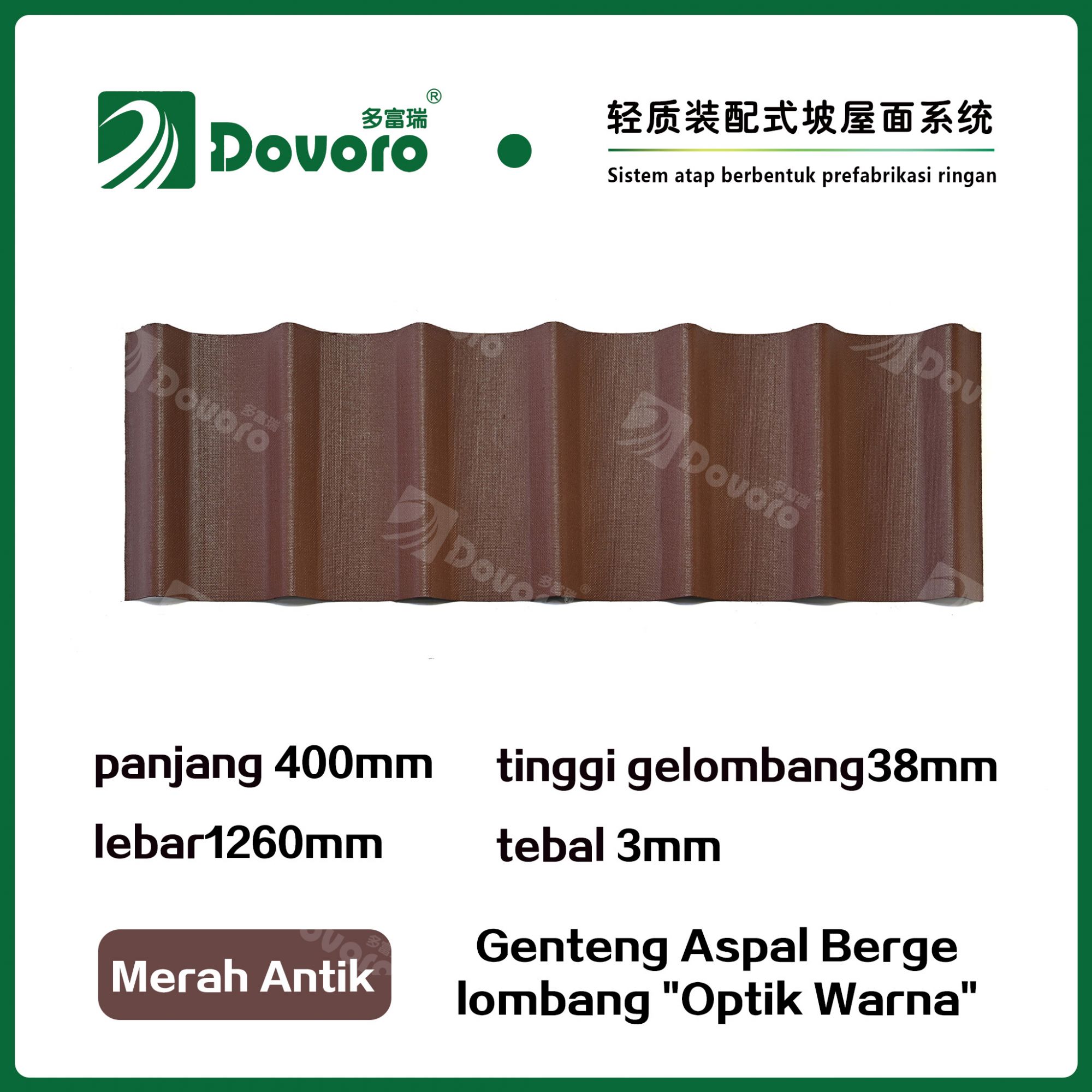 Genteng aspal bergelombang Dovoro "Optik Warna" terbuat dari serat mineral tumbuhan yang direndam dalam aspal. Lapisan dasar yang dibentuk sekali direndam dalam aspal pada suhu tinggi, membuat genteng lebih kokoh secara keseluruhan. Resin tahan panas memastikan kekuatan dan kekakuan genteng; Material baku impor, dikombinasikan dengan teknologi pewarnaan canggih, memastikan warnanya tahan lama, dan proses penyemprotan warna campuran membuat genteng terlihat elegan, indah dalam warna, dan memiliki tekstur tiga dimensi.