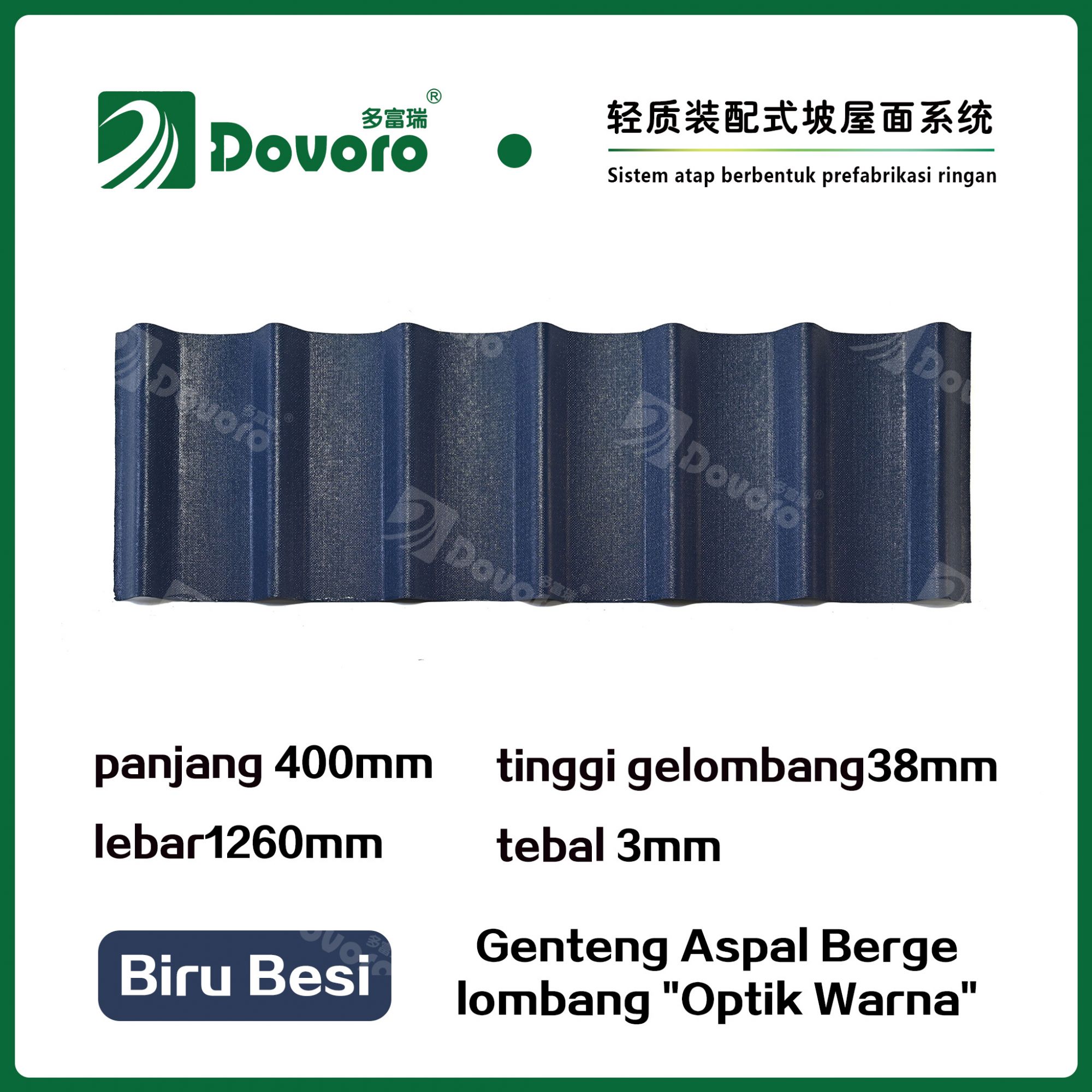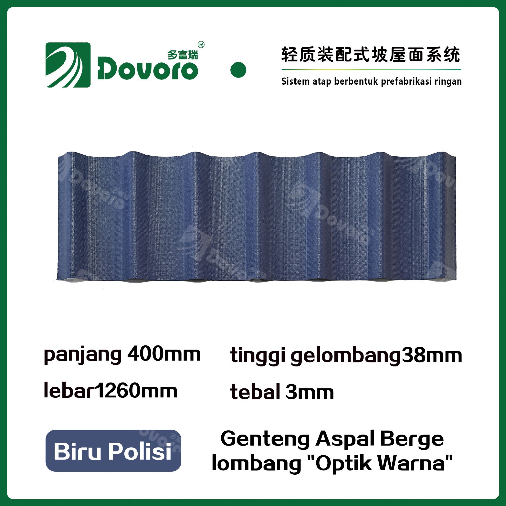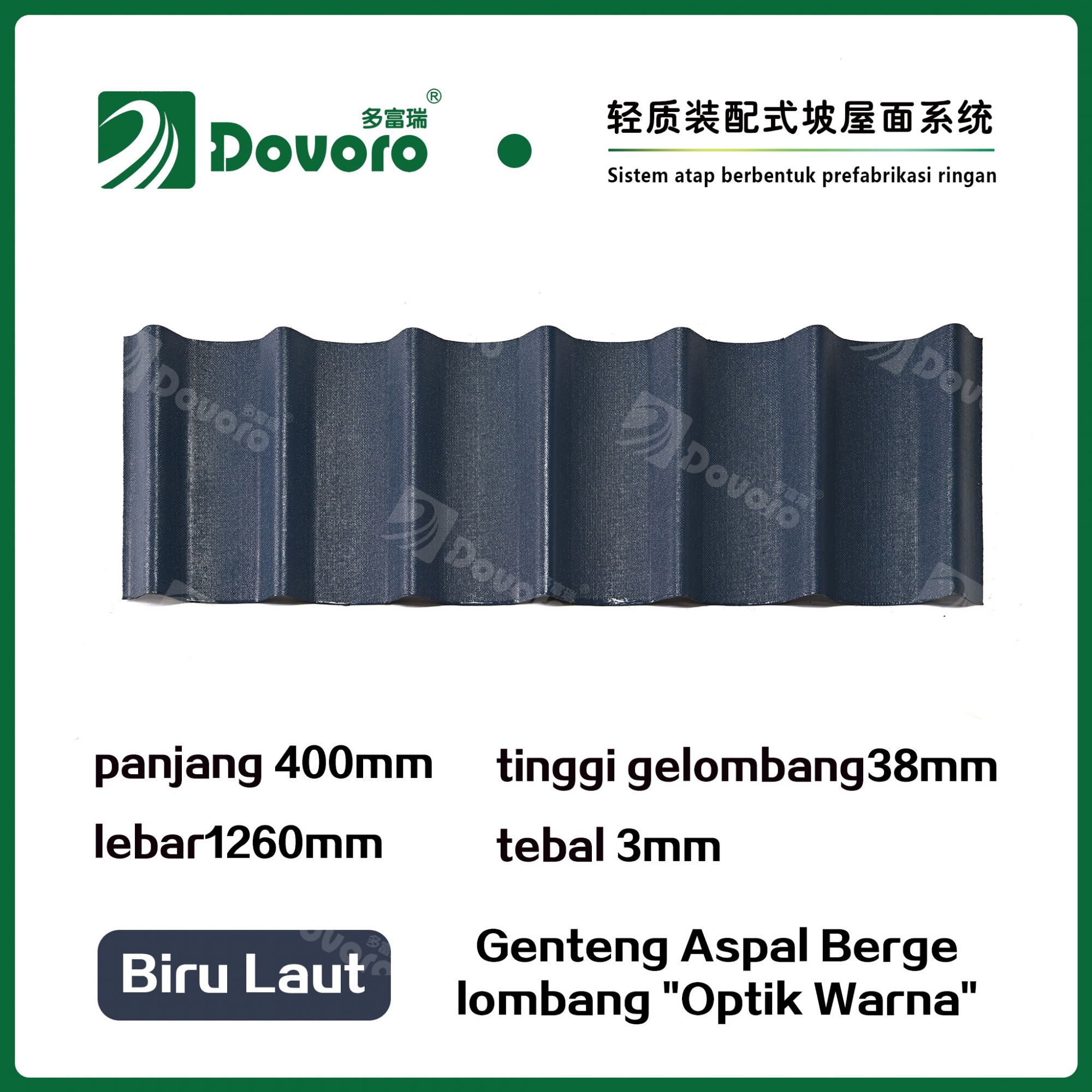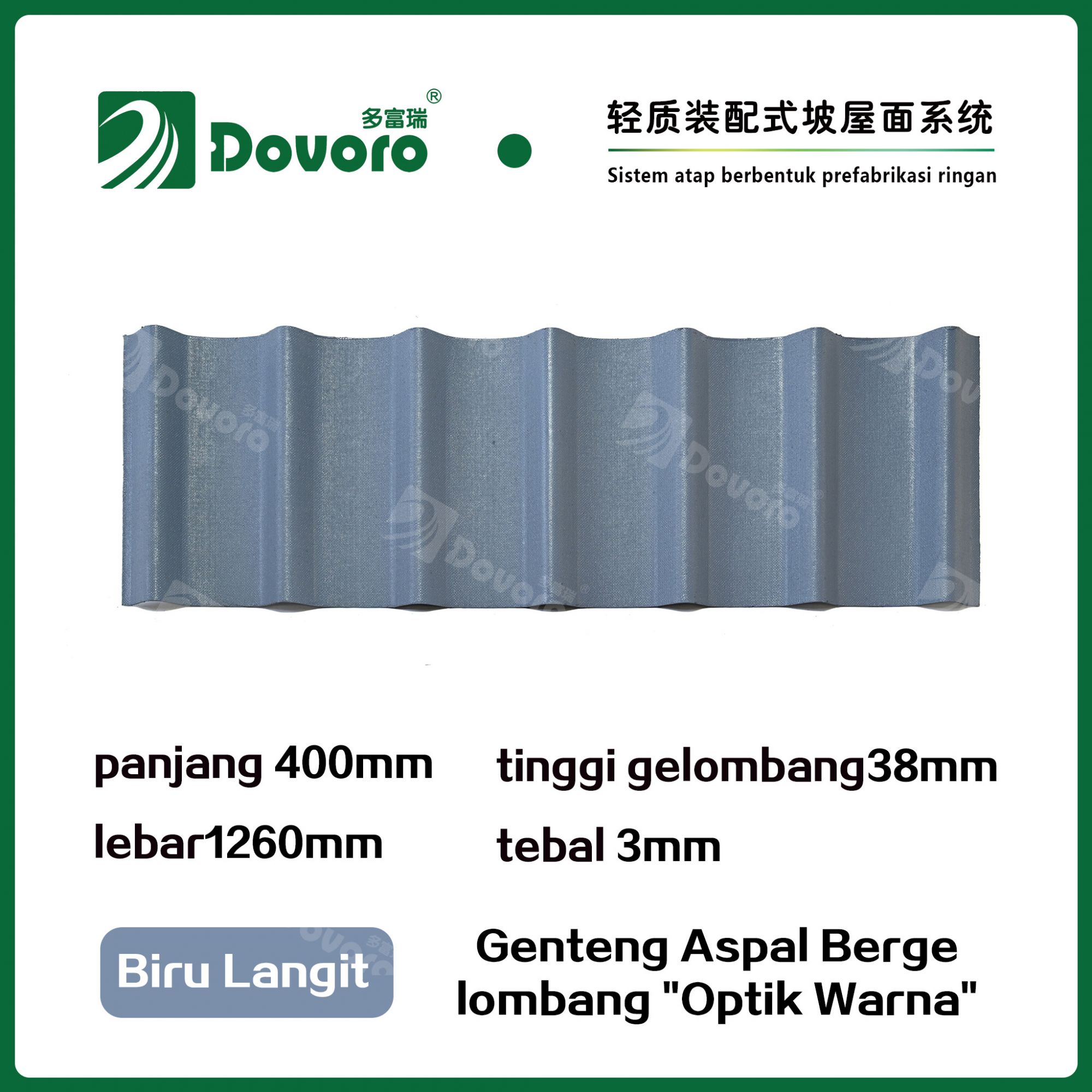 Genteng aspal bergelombang Dovoro "Optik Warna" terbuat dari serat mineral tumbuhan yang direndam dalam aspal. Lapisan dasar yang dibentuk sekali direndam dalam aspal pada suhu tinggi, membuat genteng lebih kokoh secara keseluruhan. Resin tahan panas memastikan kekuatan dan kekakuan genteng; Material baku impor, dikombinasikan dengan teknologi pewarnaan canggih, memastikan warnanya tahan lama, dan proses penyemprotan warna campuran membuat genteng terlihat elegan, indah dalam warna, dan memiliki tekstur tiga dimensi.