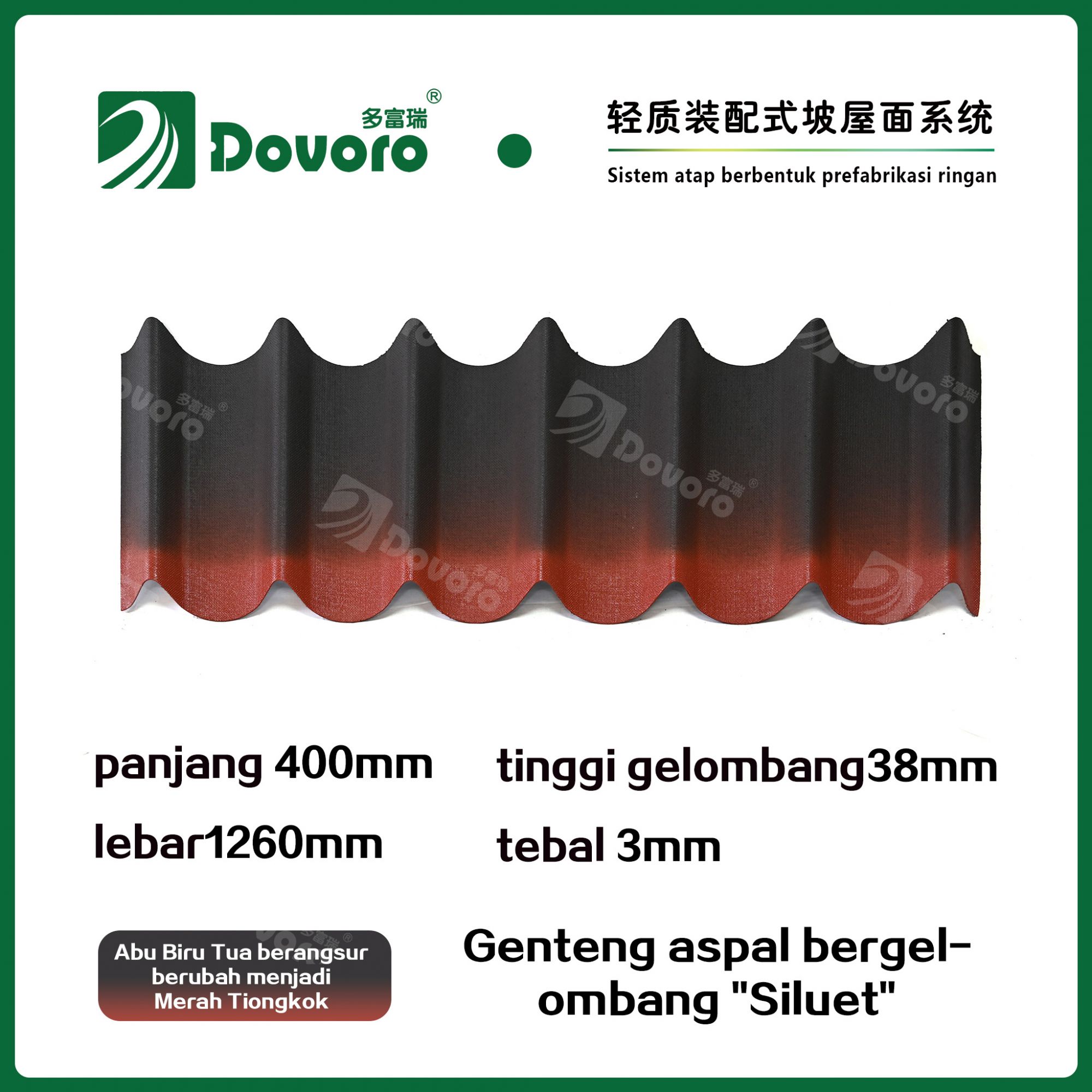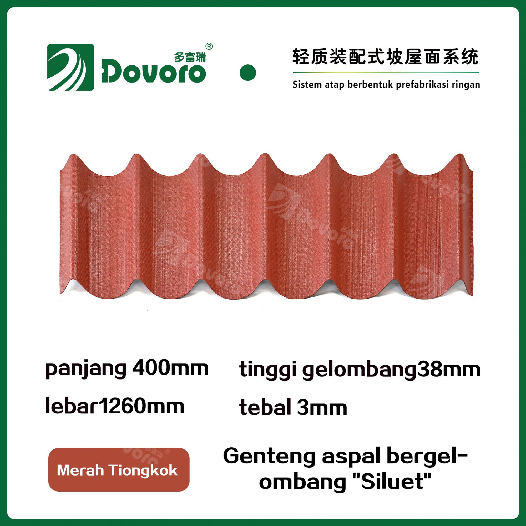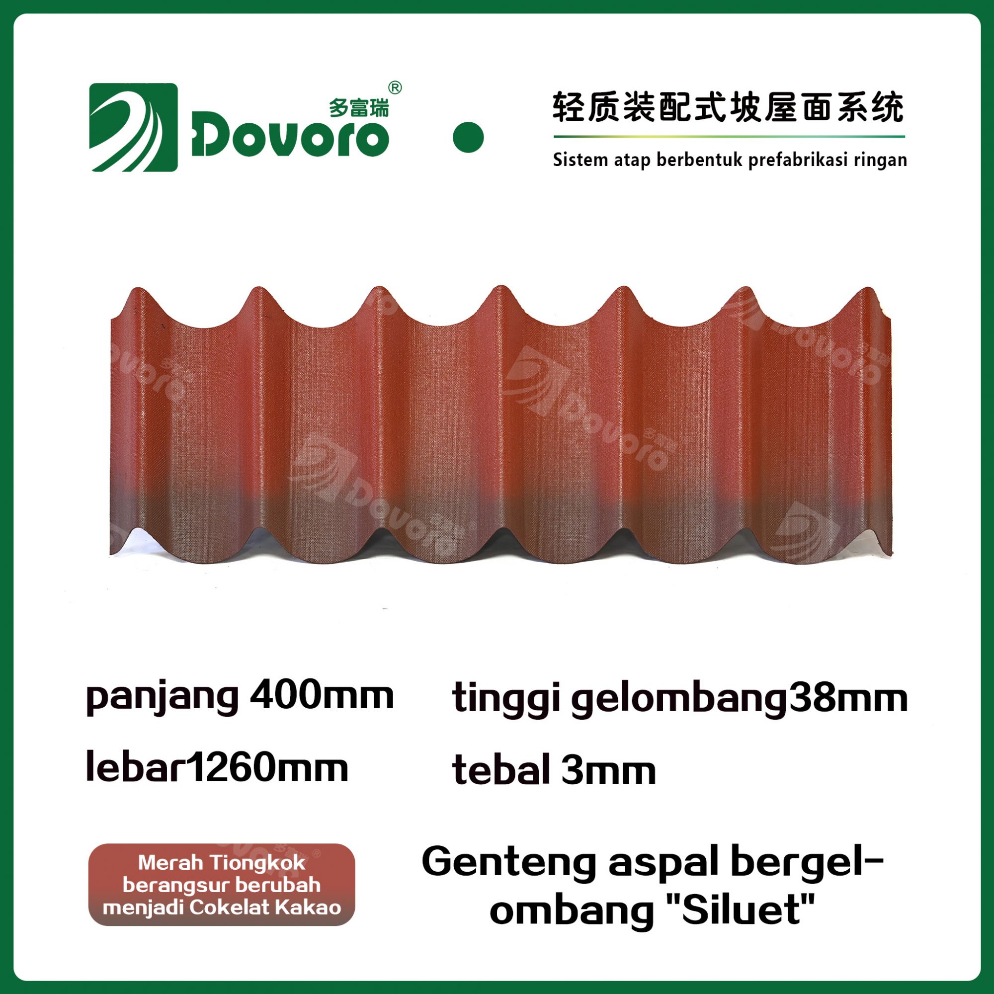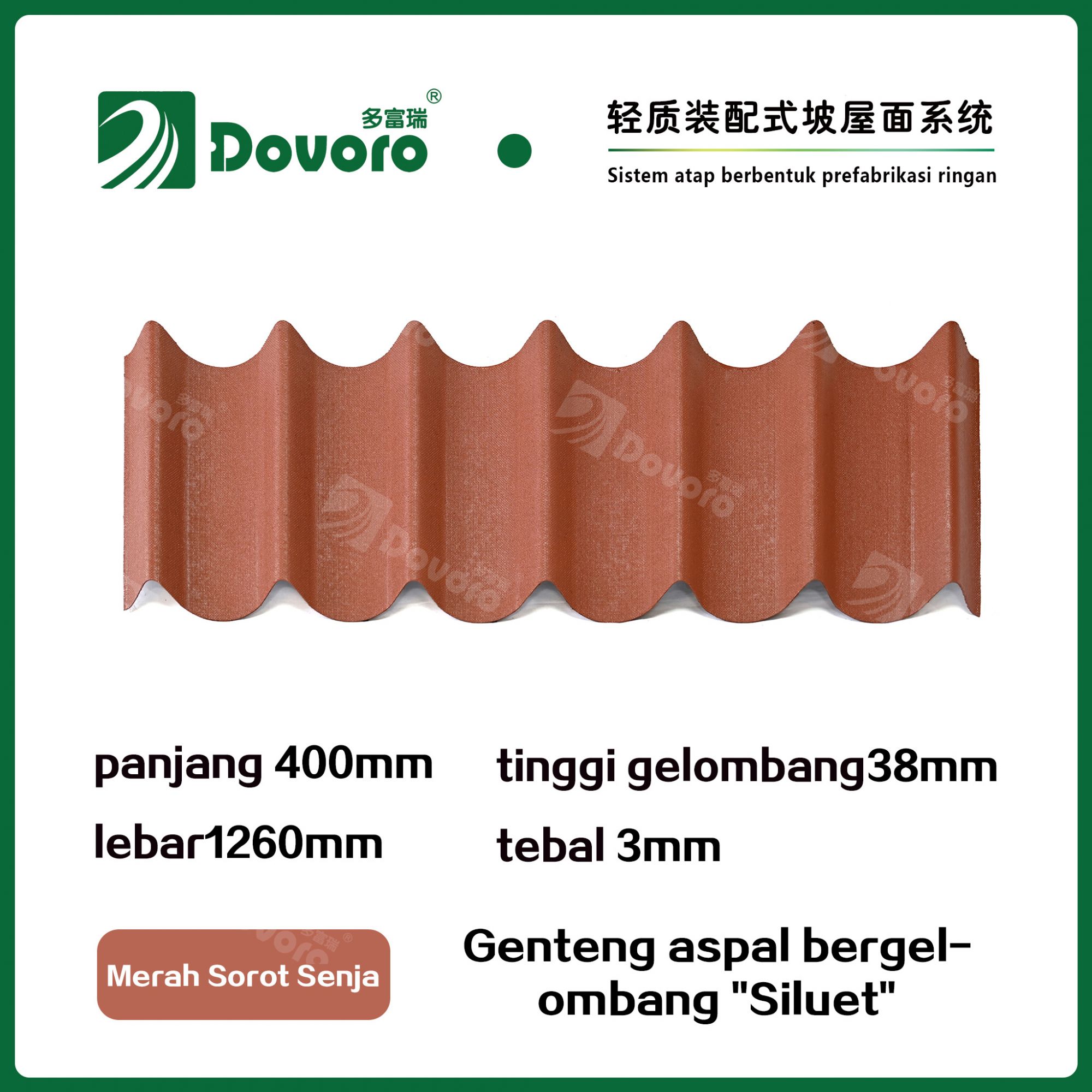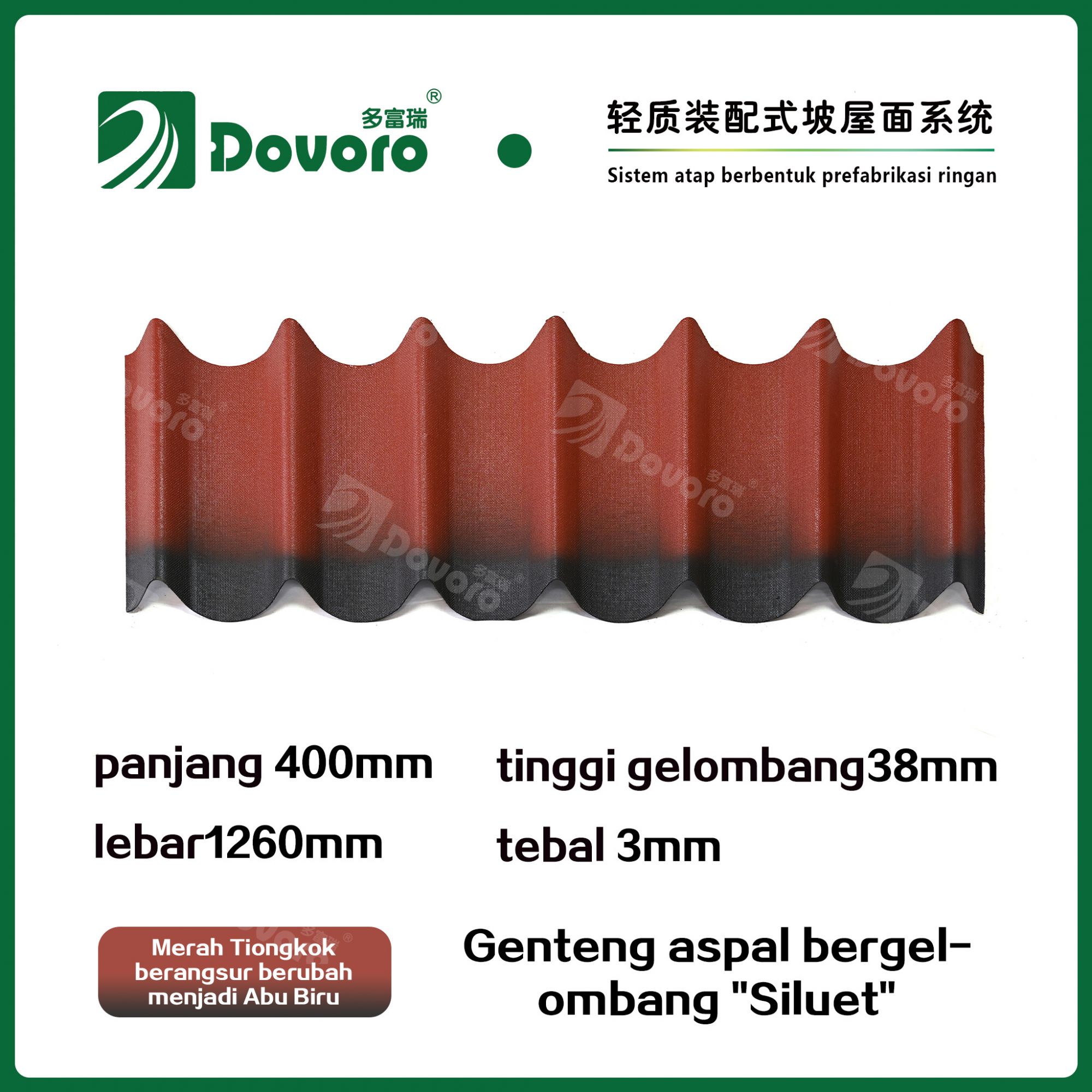 Genteng aspal bergelombang "Siluet" Dovoro terbuat dari serat mineral tumbuhan yang direndam dalam aspal. Plat dasar yang dibentuk sekali direndam dalam aspal pada suhu tinggi, menjadikan genteng ini lebih kokoh secara keseluruhan; Resin tahan panas menjamin kekuatan dan kekakuan genteng; dengan adanya teknologi pewarnaan canggih, material baku impor dipastikan memiliki warna yang tahan lama, dan proses penyemprotan warna campuran membuat genteng ini tampak elegan, berwarna cantik, dan memberikan tampilan tiga dimensi.