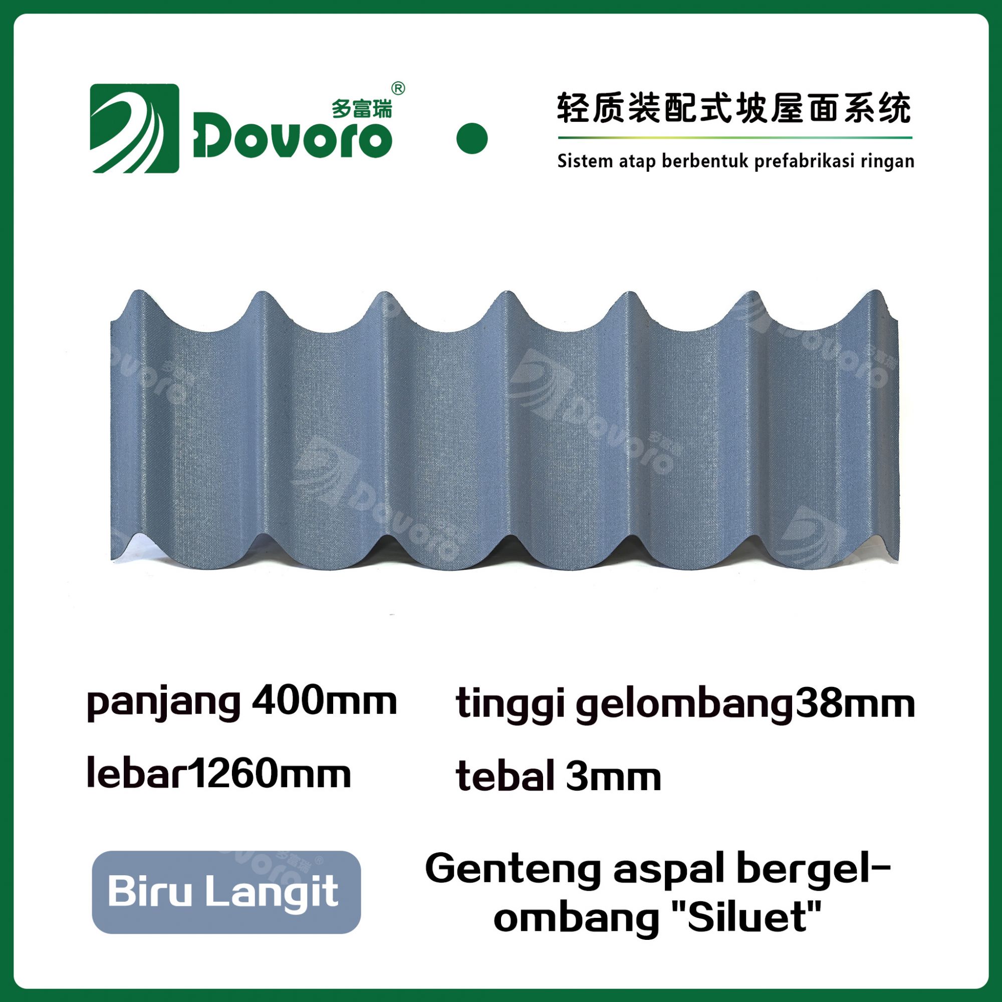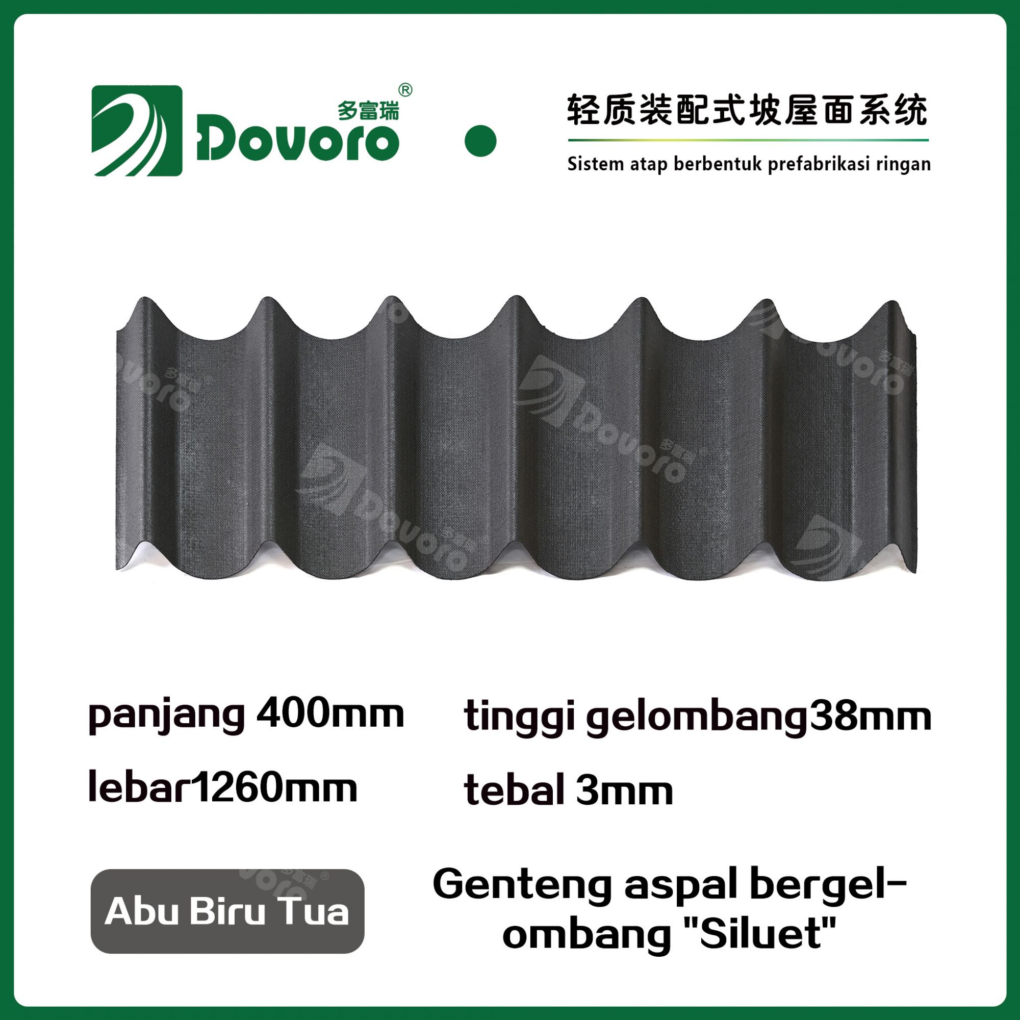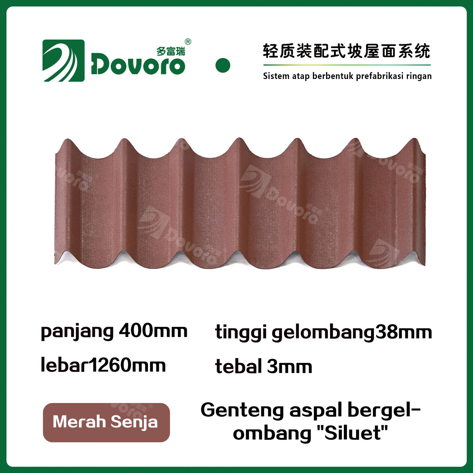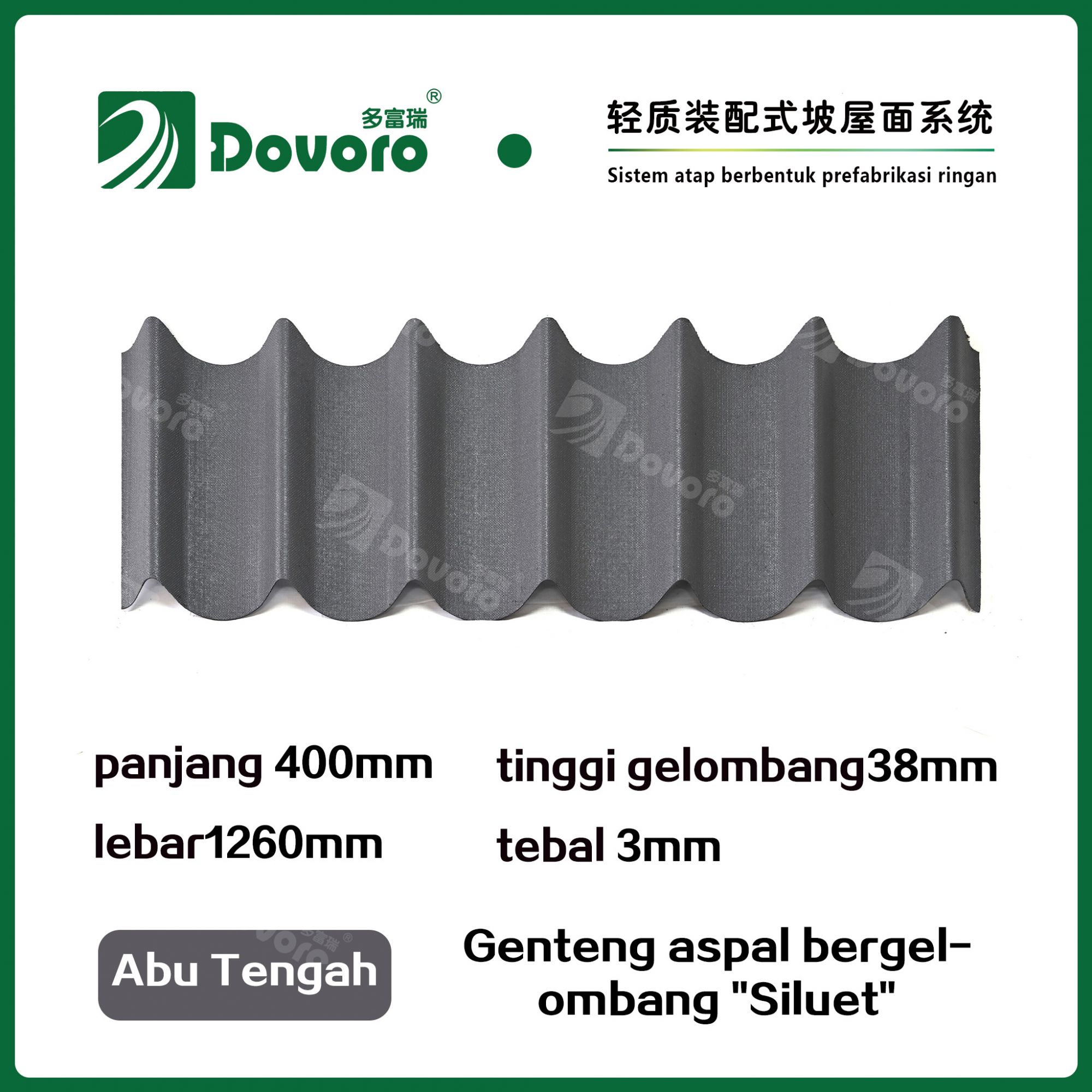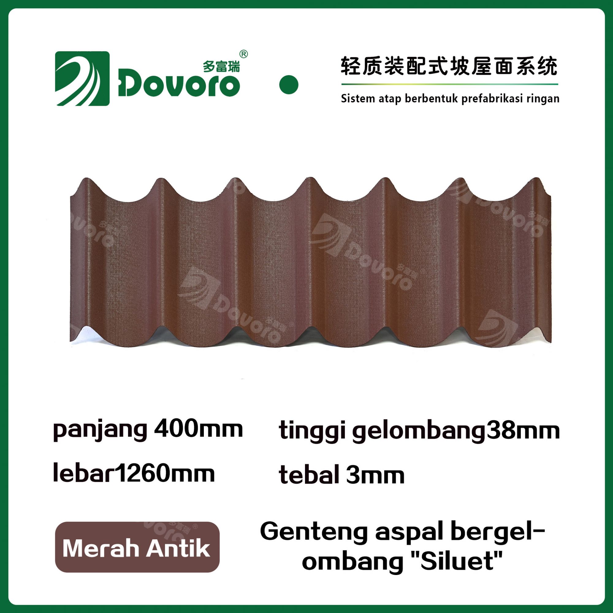 Genteng aspal bergelombang "Siluet" Dovoro terbuat dari serat mineral tumbuhan yang direndam dalam aspal. Plat dasar yang dibentuk sekali direndam dalam aspal pada suhu tinggi, menjadikan genteng ini lebih kokoh secara keseluruhan; Resin tahan panas menjamin kekuatan dan kekakuan genteng; dengan adanya teknologi pewarnaan canggih, material baku impor dipastikan memiliki warna yang tahan lama, dan proses penyemprotan warna campuran membuat genteng ini tampak elegan, berwarna cantik, dan memberikan tampilan tiga dimensi.
