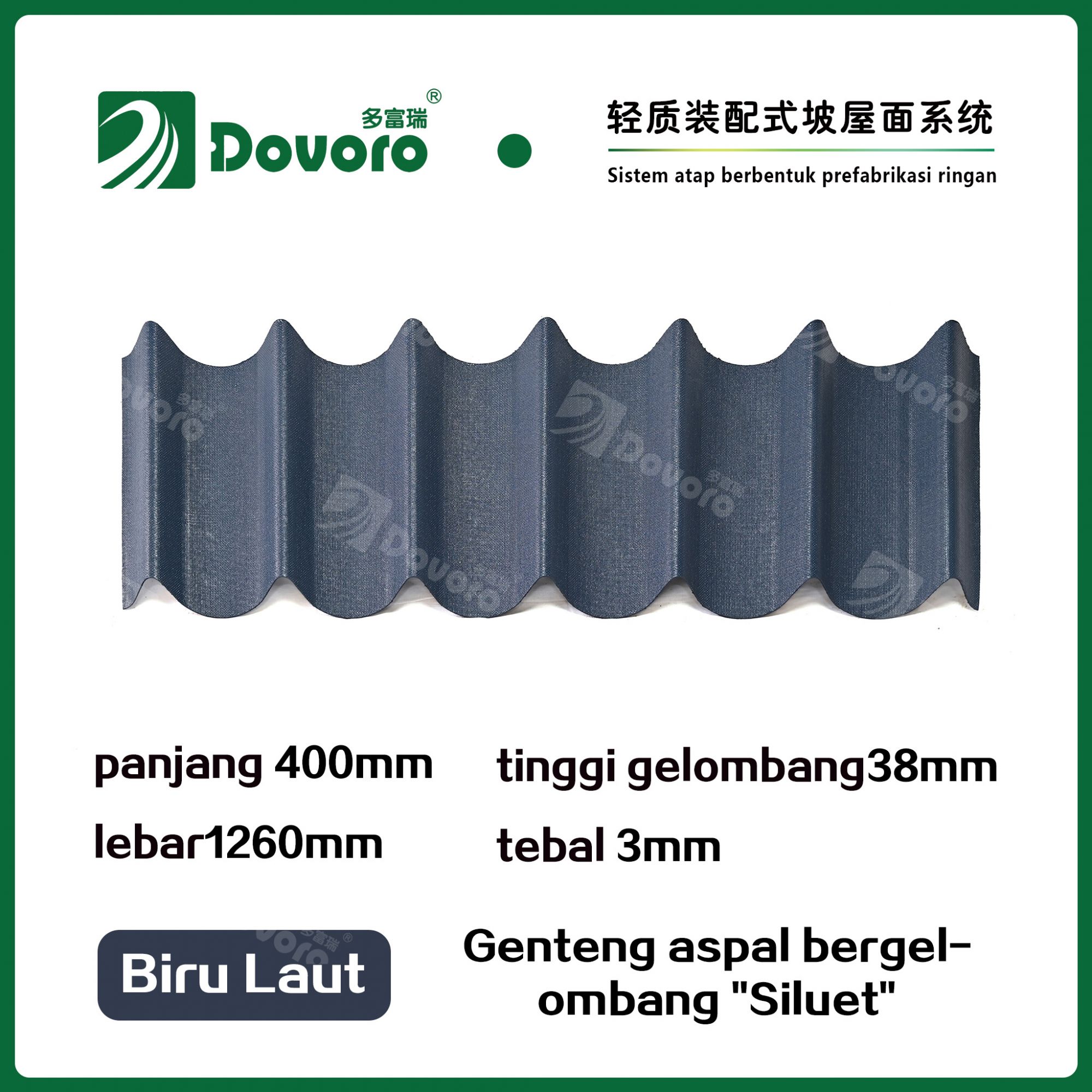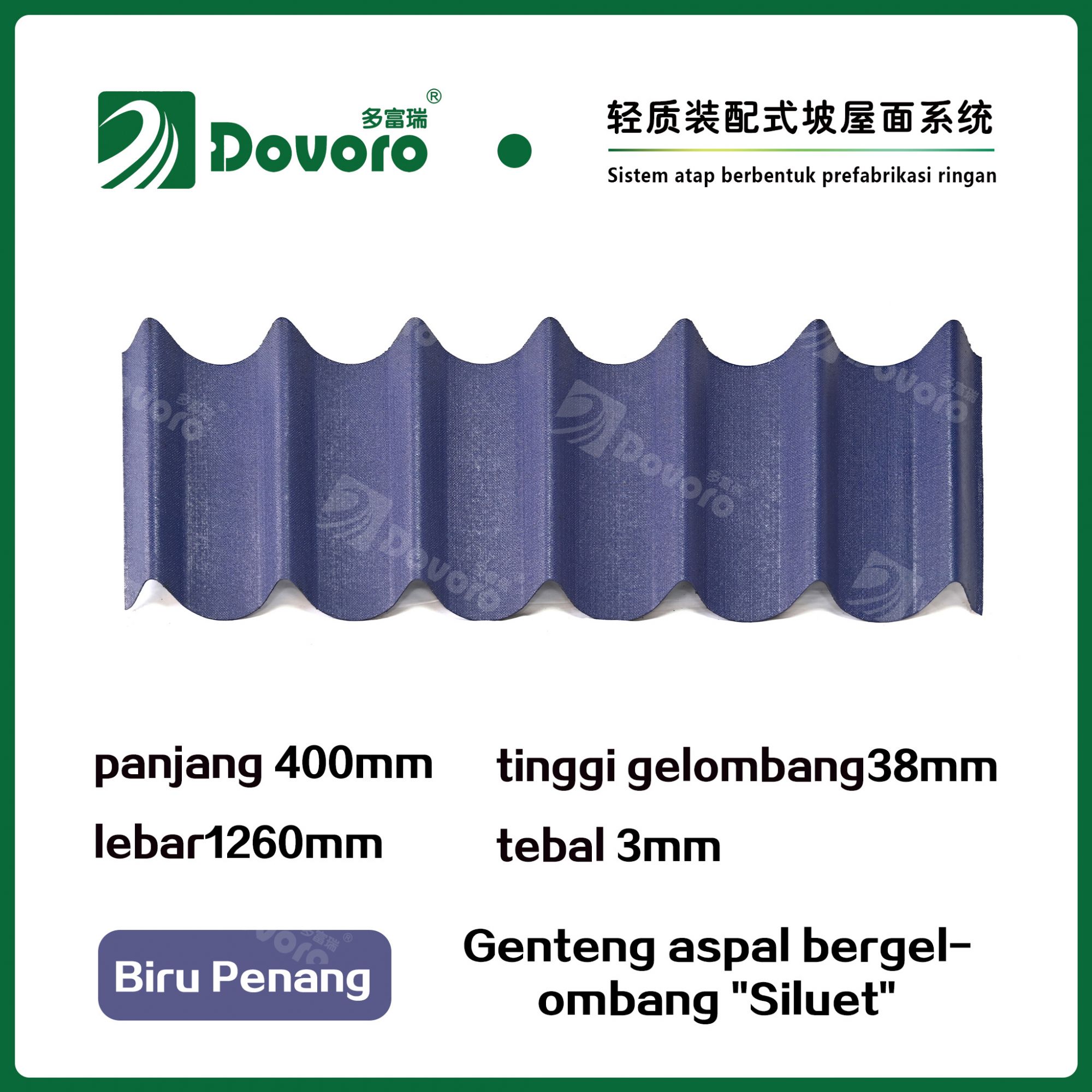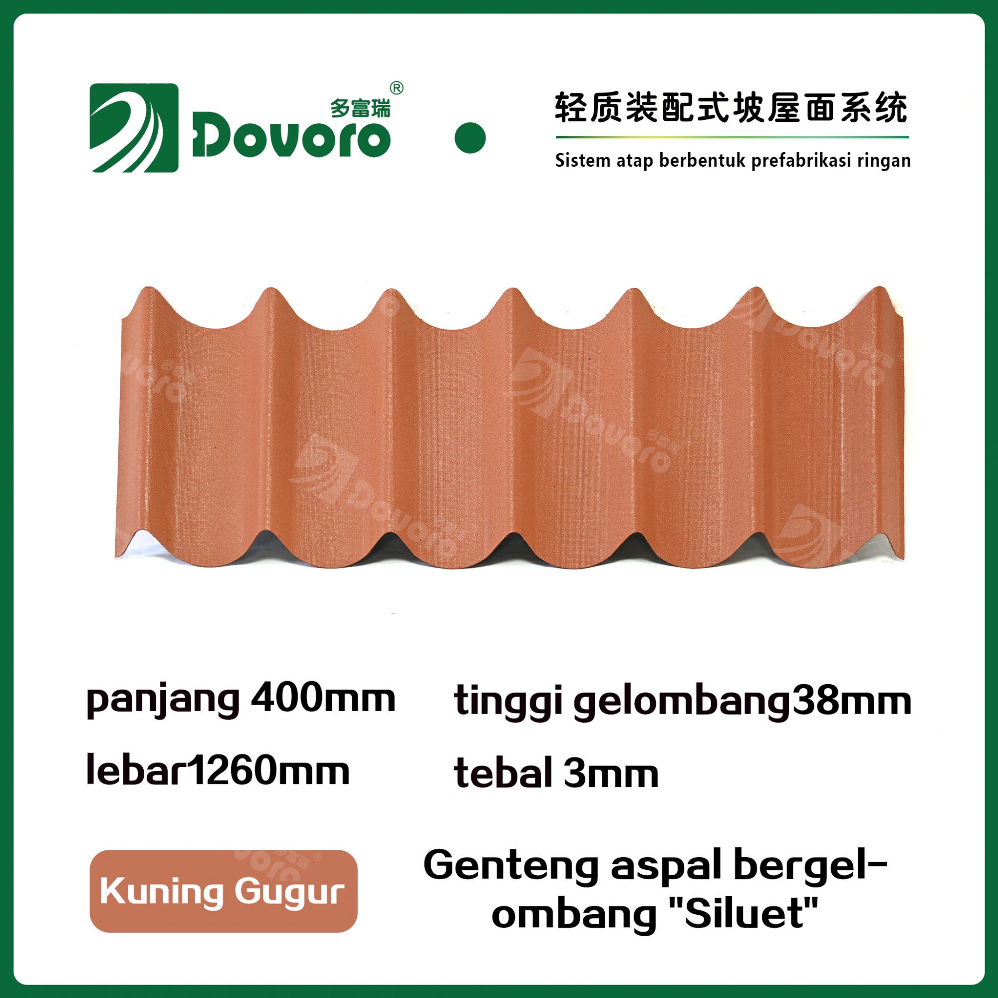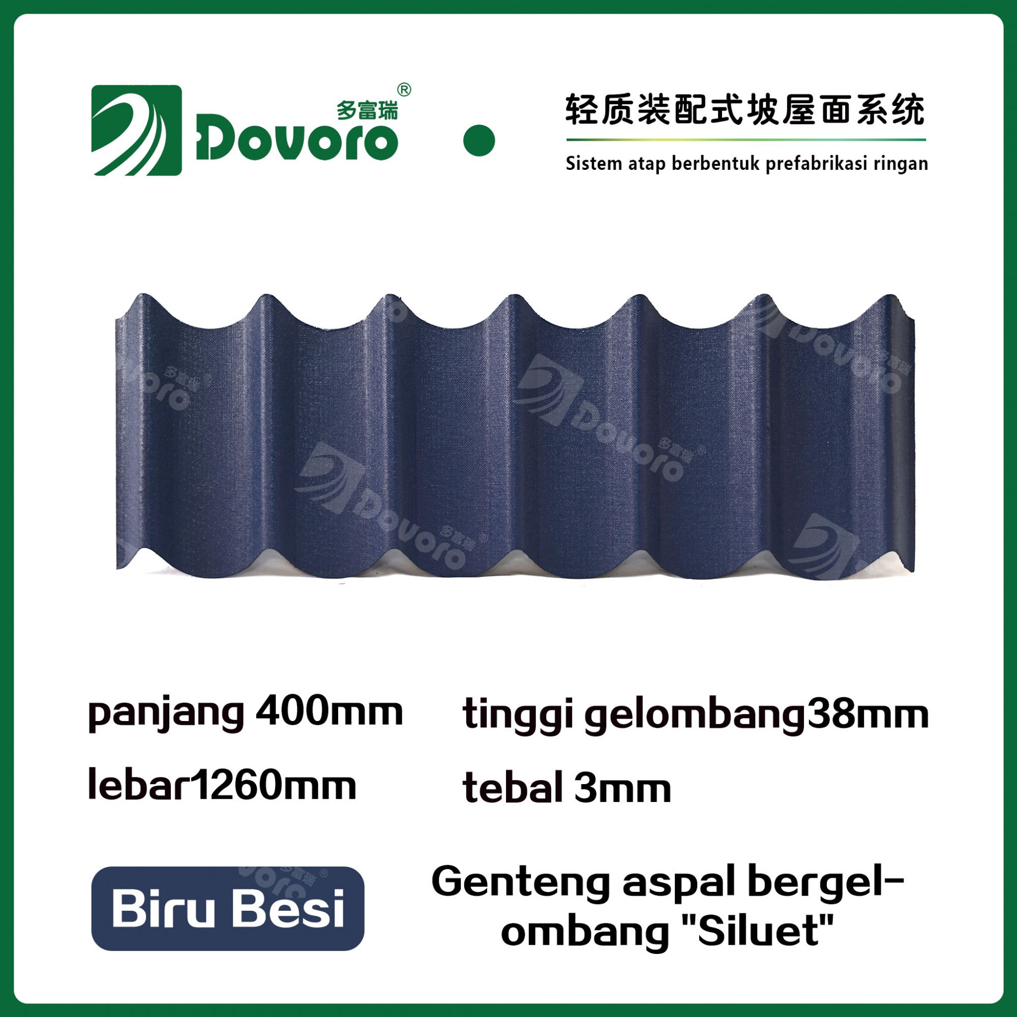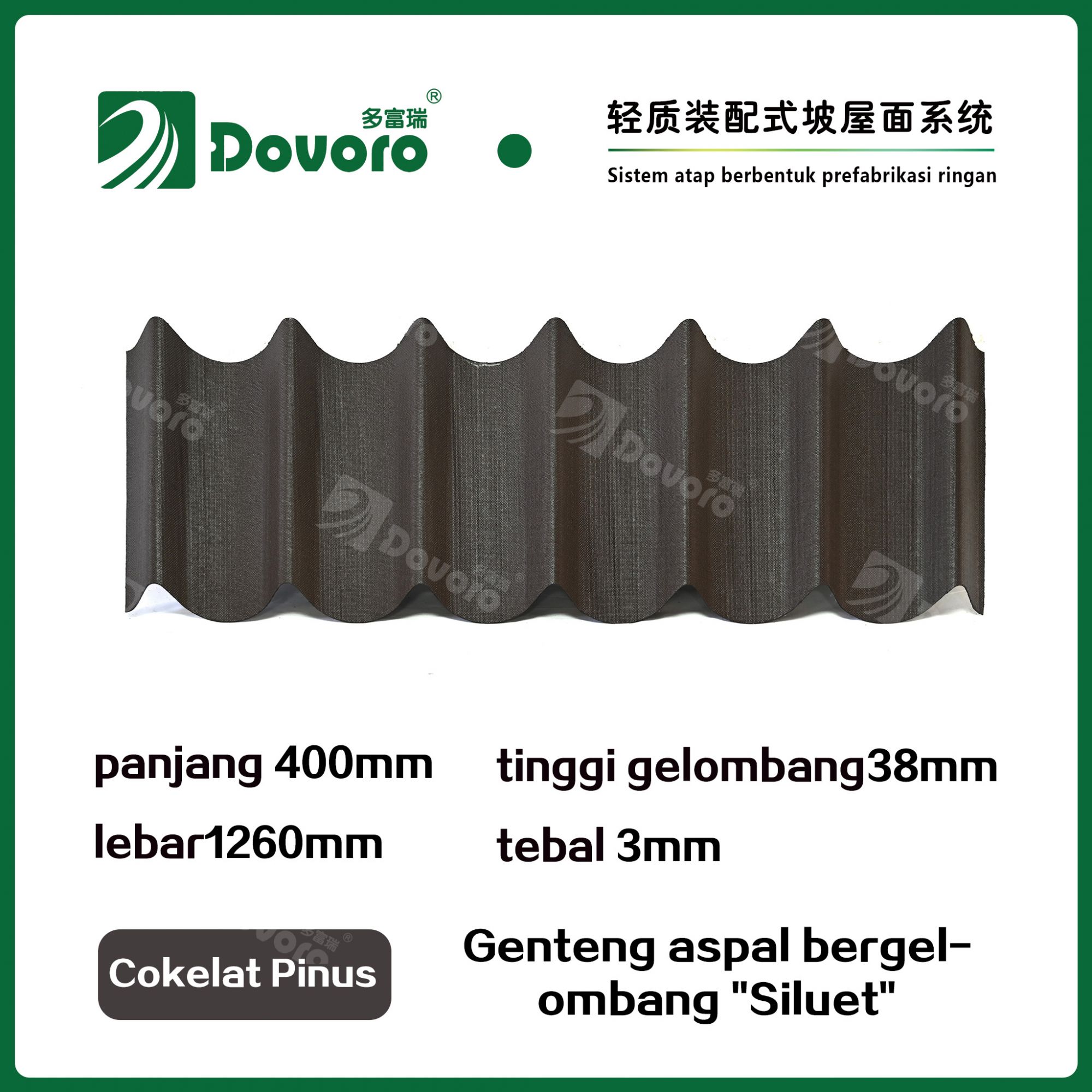 Genteng aspal bergelombang "Siluet" Dovoro terbuat dari serat mineral tumbuhan yang direndam dalam aspal. Plat dasar yang dibentuk sekali direndam dalam aspal pada suhu tinggi, menjadikan genteng ini lebih kokoh secara keseluruhan; Resin tahan panas menjamin kekuatan dan kekakuan genteng; dengan adanya teknologi pewarnaan canggih, material baku impor dipastikan memiliki warna yang tahan lama, dan proses penyemprotan warna campuran membuat genteng ini tampak elegan, berwarna cantik, dan memberikan tampilan tiga dimensi.